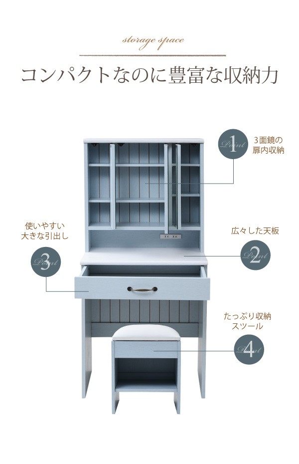 | バイカラーで魅せるフレンチカントリースタイルの三面鏡ドレッサー&スツール。 コンパクトサイズなので一人暮らしにも最適。 三面鏡扉の裏はたっぷり収納できる空間。可動棚で自由に調整できます。 広々とした天板で毎日のメイクも快適に。 広めの引出は小物のコスメの収納に最適。 セットのスツールは座面下にも収納スペースがあります。 丸みを帯びたフォルムとアンティーク調の取っ手といったディテールがカントリーテイストを漂わせます。 |