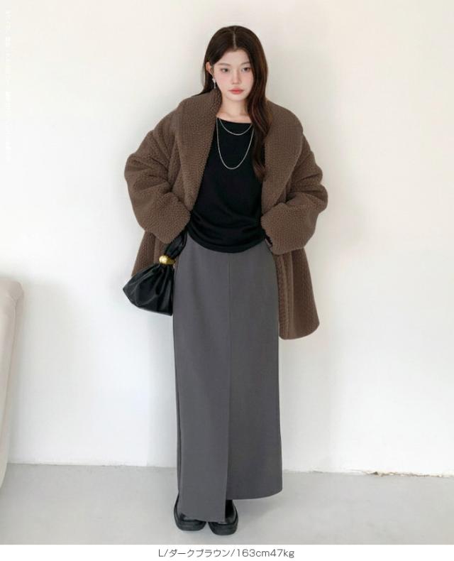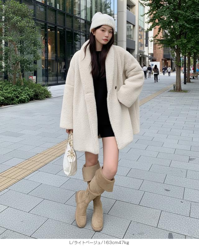 【素材感・着心地】 見た目にも暖かさを感じる、毛足の長いもこもことしたボア素材を採用しました。 ボリューム感がありながらも、毛と毛の間に空気を溜め込むため、 驚くほど軽量で暖かいのが特徴です。 厚手のコートにありがちな重さを感じさせない、 快適な着心地を実現しています 【シルエット・サイズ感】 ゆったりとした「オーバーサイズ」と「ビッグシルエット」のデザイン。 身体のラインを拾わないボリューミーなシルエットは、 体型カバー効果はもちろん、 対比で華奢に見せる効果も期待できます。ヒップが隠れるミドル丈なので、 幅広いボトムスとの相性も抜群です 【着回し&コーデ提案】 存在感のあるアウターなので、 ボトムスに細身のシルエットを選ぶと、 全体にメリハリがつきバランスの良い着こなしが完成します。 Iラインを強調するスリット 入りやセンターライン入りのボトムスを合わせると、 よりスッキリと見えます。 きれいめなツヤ感のあるスカートと合わせ 大人っぽいフェミニンスタイルに、 スウェットパンツやデニムと合わせて カジュアルにも着こなせます |