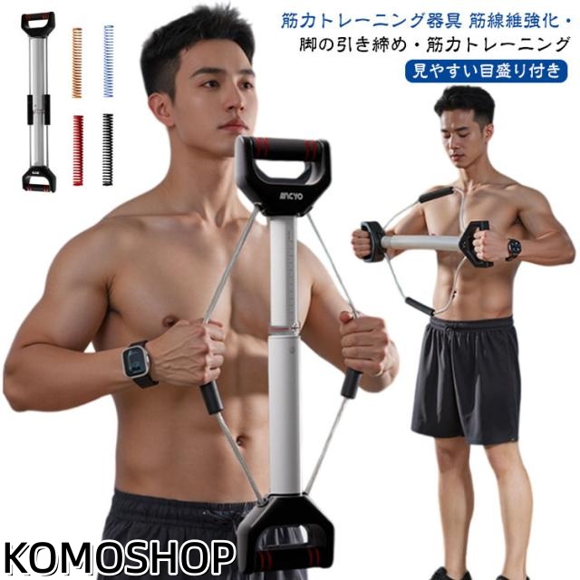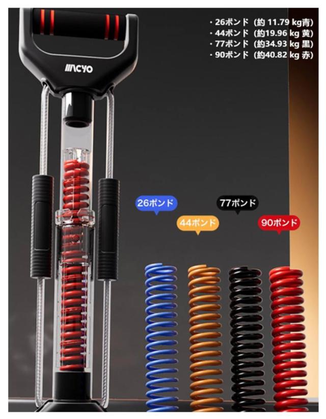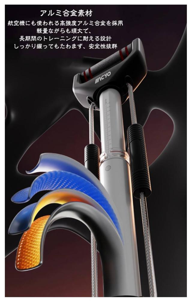 | 筋力トレーニング器具 筋線維強化・脚の引き締め・筋力トレーニング 1.厚手クッションハンドル 厚みのあるクッション素材をグリップ部に採用 トレーニング中も手に負担がかからず、握りやすく快適 長時間の使用でも痛くなりにくい設計 2.見やすい目盛り付き 見やすい刻度メモリ付きで、トレーニングの負荷をひと目で確認 自分の力に合ったレベルで、効率的に鍛えられる 強度設定がわかりやすく、進捗管理にも便利 3.アルミ合金素材 航空機にも使われる高強度アルミ合金を採用 軽量ながらも頑丈で、長期間のトレーニングに耐える設計 しっかり握ってもたわまず、安全性抜群 4.スチールワイヤー内蔵ケーブル 内部にスチールワイヤーを内蔵した高耐久ケーブル 高い引っ張り強度と伸縮性で、ハードな使用にも耐える構造 繰り返しのトレーニングでも劣化しにくく、安心・長持ち 5.収納ラクラク・場所を取らない コンパクト設計で省スペース収納 薄型ボディで壁に立てかけてもスッキリ インテリアに馴染みやすく、出しっぱなしでもおしゃれ | |