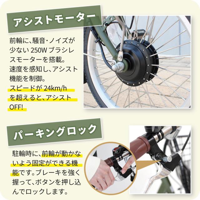 前輪に、騒音・ノイズが少ない250Wブラシレスモーターを搭載。速度を感知し、アシスト機能を制御。スピードが24km/hを超えると、アシストOFF。