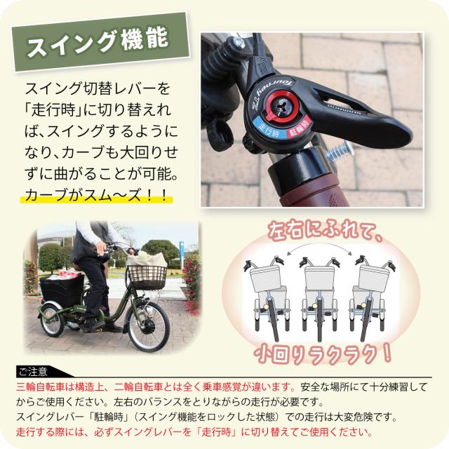 ・電動アシスト三輪自転車は、二輪自転車とは乗車感覚が全く違います。安全な場所にて十分練習してからご使用ください。