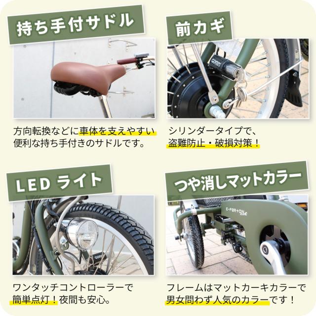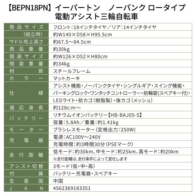 BEPN18PN ミムゴ ノーパンク ロータイプ電動アシスト三輪自転車 E-PARTON PLUS マットカーキ メーカー直送