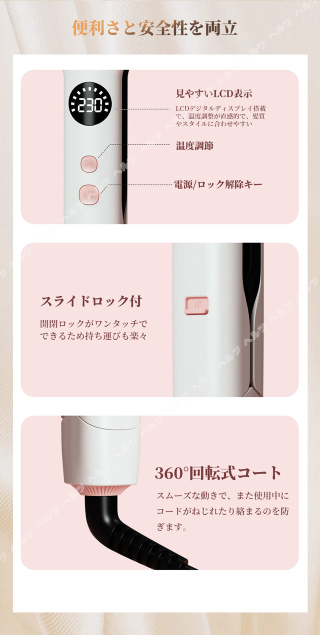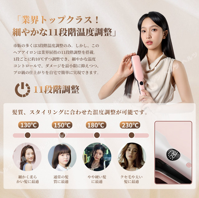 11段階温度調節:130℃〜230℃まで細かく調整可能。細い髪から太い髪まで、あらゆる髪質に対応。