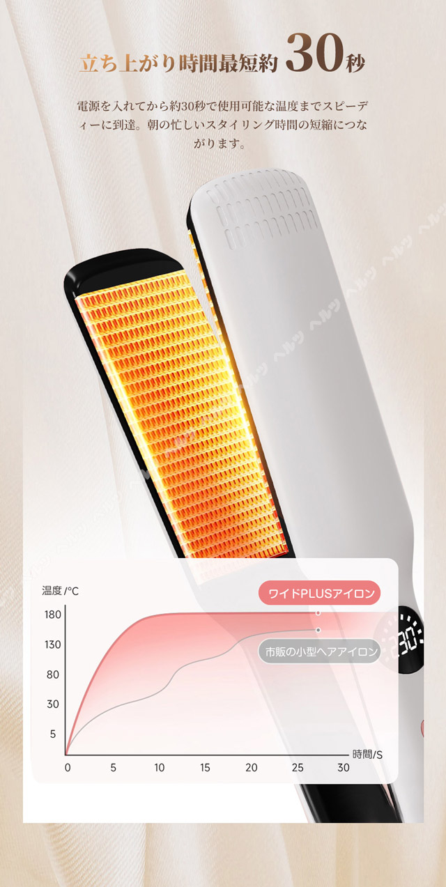 30秒速熱技術:朝の忙しい時間もすぐに使用可能、待たずにスタイリング完了。
