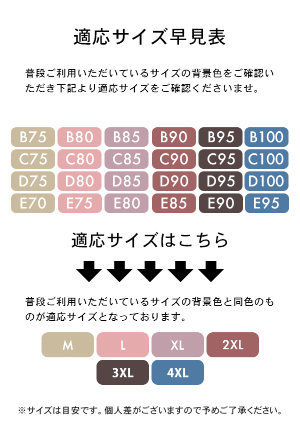 M(B75,C75,D75,E70対応) L(B80,C80,D80,E75対応) XL(B85,C85,D85,E80対応) 2XL(B90,C90,D90,E85対応) 3XL(B95,C95,D95,E90対応) 4XL(B100,C100,D100,E95対応) |