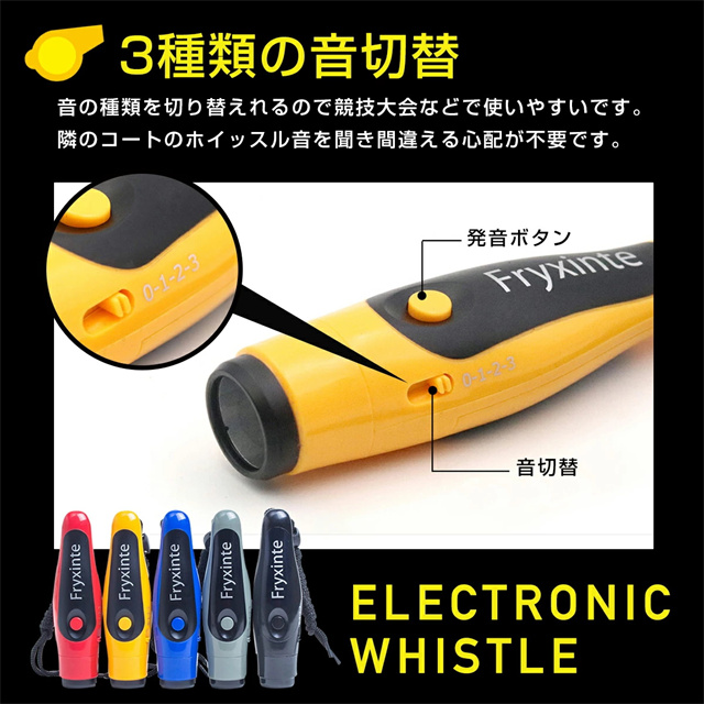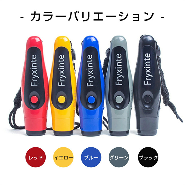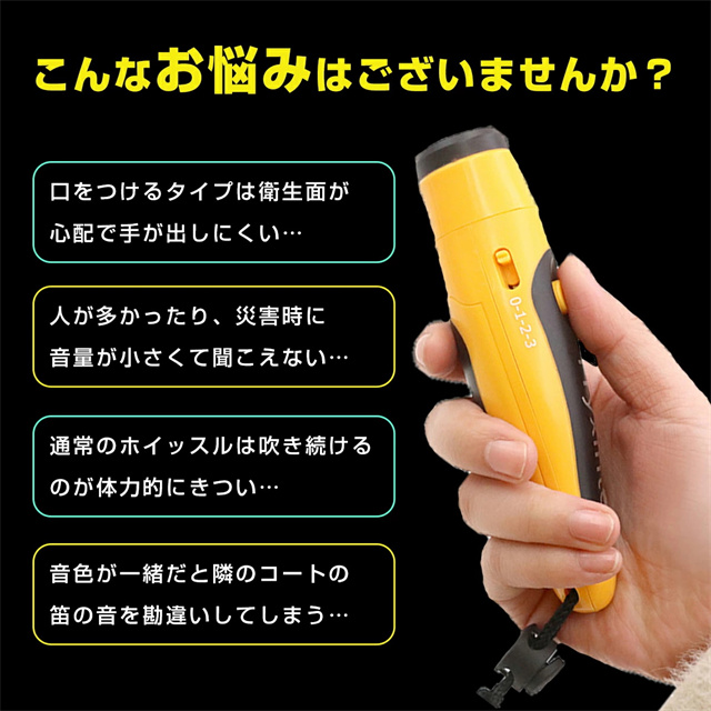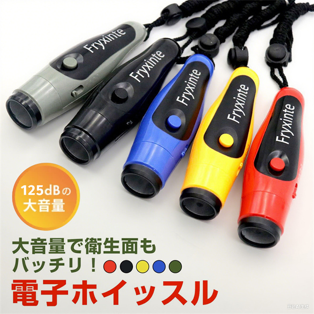 | 特徴 | ボタンを押すだけのかんたん操作の電子ホイッスル。 スポーツ大会の審判、防災グッズ、緊急用、防災訓練や災害時のSOSなどにも活躍します。 ◆最大125dbの大音量 広い競技場や賑やかな場所でも大音量タイプの電子ホイッスルならよく聞こえます。 お子様の防犯対策や緊急時、などにも使えます。 ◆3種類の音色を切替 競技大会で隣のコートのホイッスル音を聞き間違える心配も要りません。 ◆衛生面も心配不要 口を直接つけて使わないので衛生的で安心安全。 複数人での使用も気軽にできます。 ◆ストラップ付き 首に掛けたり、手首に引っ掛けることで落下を防ぐことができます。 ◆持ち運びしやすい 小型軽量でコンパクト。 専用ポーチ付きで持ち運び時も傷つきにくく便利です。 |
