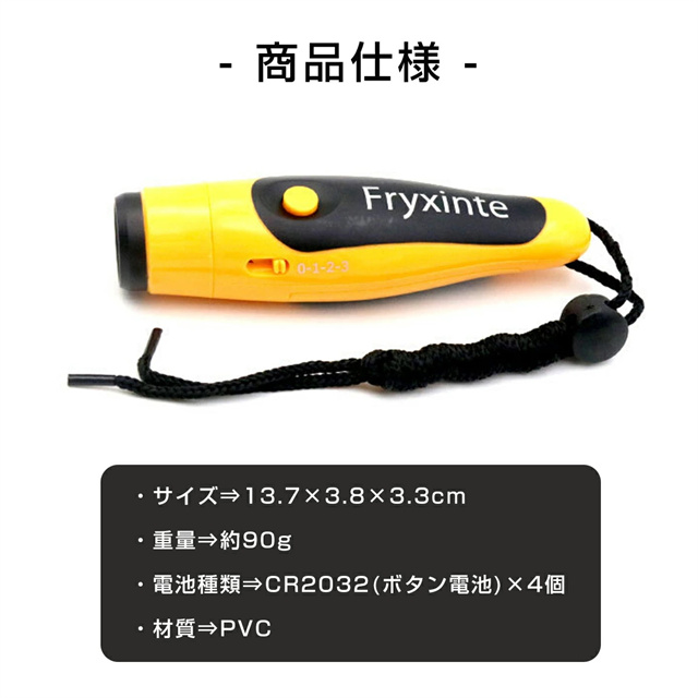 | 仕様 | ◆サイズ:13.7×3.8×3.3cm ◆重量:約90g ◆電池種類:CR2032 (ボタン電池)×4個 ◆材質:PVC |