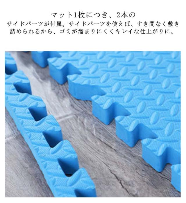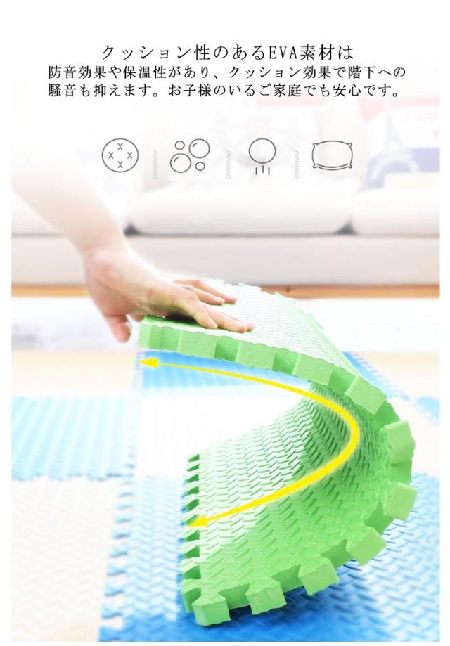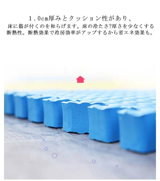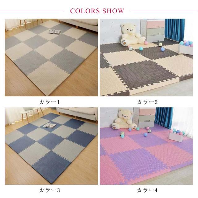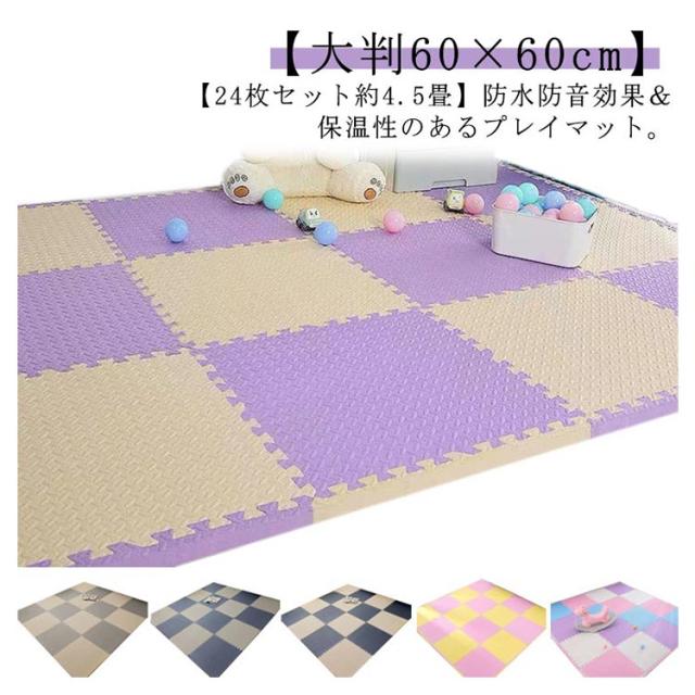 | 【大判60×60cm】【24枚セット約4.5畳】防水防音効果&保温性のあるプレイマット。 クッション性のあるEVA素材は防音効果や保温性があり、クッション効果で階下への騒音も抑えます。お子様のいるご家庭でも安心です。 1.0cm厚みとクッション性があり、床に傷が付くのを和らげます。 床の冷たさ?厚さを少なくする断熱性。断熱効果で冷房効率がアップするから省エネ効果も。 防水性に優れているから、汚れてもサッと一拭きすればOK。 マットの表面には凸凹加工を施しているから滑りにくい。 軽いのでラグを敷くより扱いやすく、模様替えなども簡単。 マット1枚につき、2本のサイドパーツが付属。サイドパーツを使えば、すき間なく敷き詰められるから、ゴミが溜まりにくくキレイな仕上がりに。 60*60*1cm 単色24枚set サイドパーツ付き、豊富なテクスチャとカラーで組み合わせ自由自在。 | |