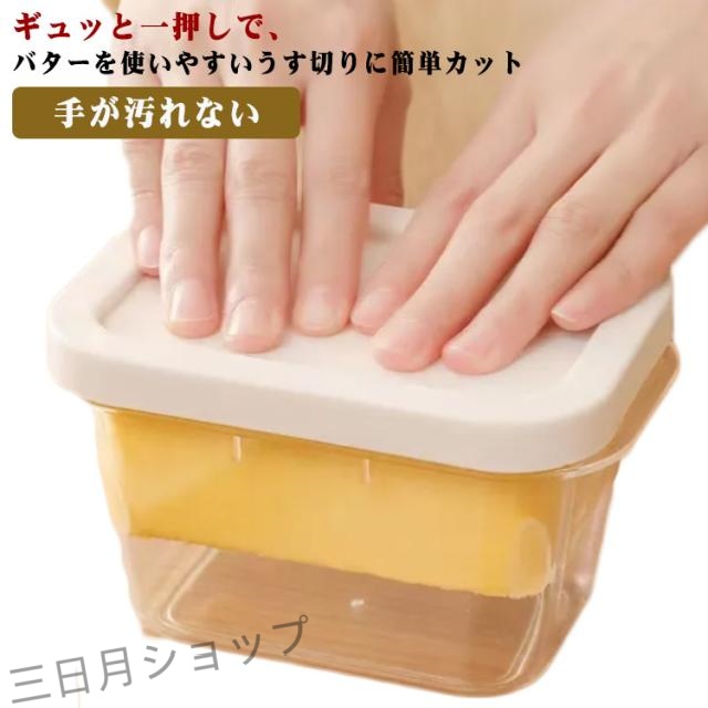 | ギュッと一押しで、バターを使いやすいうす切りに簡単カット 定量にカットできるから計量が簡単で、料理やお菓子作りの際に便利です。 フタが付いているので、カットしたバターをそのまま冷蔵庫で保存できます。 薄切りにするので、ホットケーキなどにのせても溶けやすくてうれしくなります | |