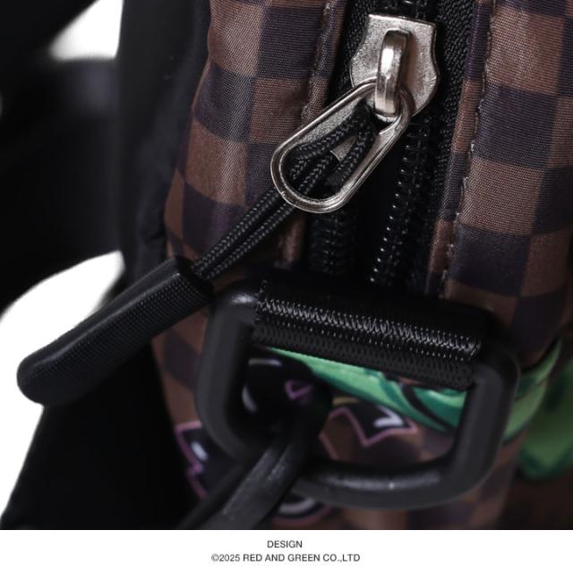 生地は、強度の高いナイロン。「茶色のブロックチェック」×「サメのキャラクター」からなるアシンメトリーデザインで仕上げたハイエンドなグラフィック。