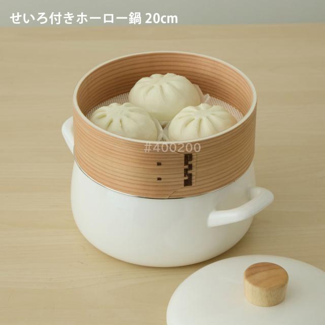 せいろ付きホーロー鍋 20cm 富士ホーロー ガス火 IH対応 1段 2段 シリコンメッシュシート SER-20W 【 琺瑯 両手鍋 竹せいろ 蒸篭 中華セイロ 蒸し セット 蒸し鍋 スチーマー 】
