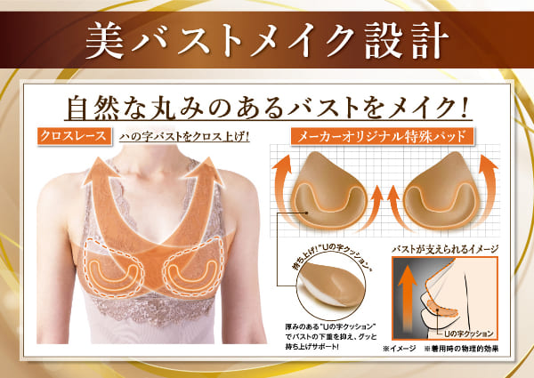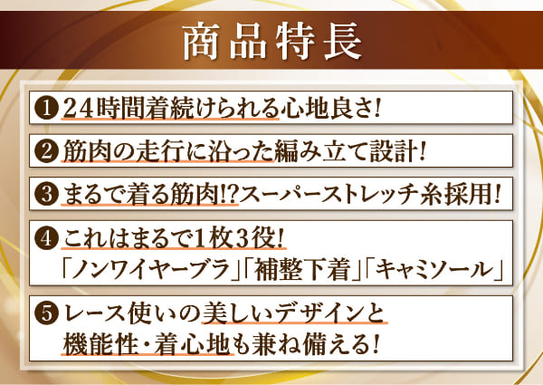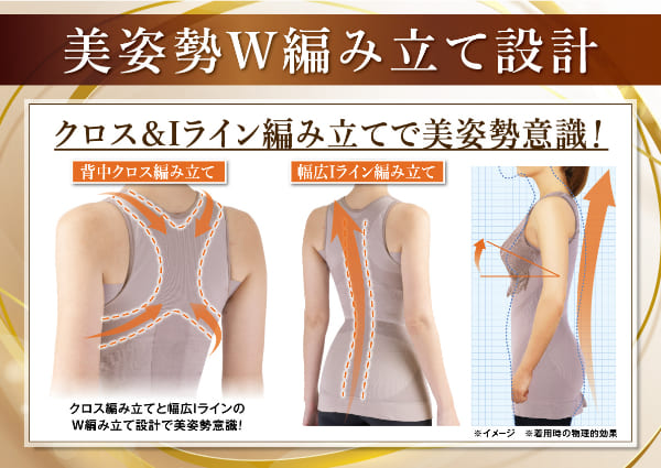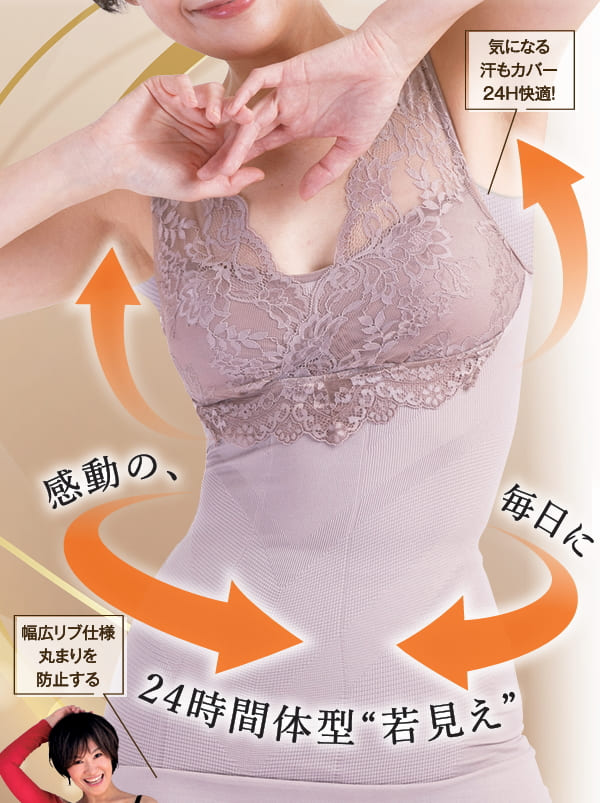 フィットネストレーナー「樫木裕実」監修、1枚3役[1]ノンワイヤーブラ[2]補整下着[3]キャミソール■24時間美しくラクに整えて楽しく動けるカラダづくりを目指した機能性インナーです。女性の身体に沿い最適な編み地を組み合わせたメーカーオリジナル編み立て技術により生まれたシェイパーで、身体を補整したり締め付けることなく快適に補整。部位によって編地を分けることで圧を変えており、伸縮性の良い糸を使用することで締め付け感を減らし、長時間はきやすい。動きやすく日常生活のパフォーマンスUPをサポートしてくれます。
