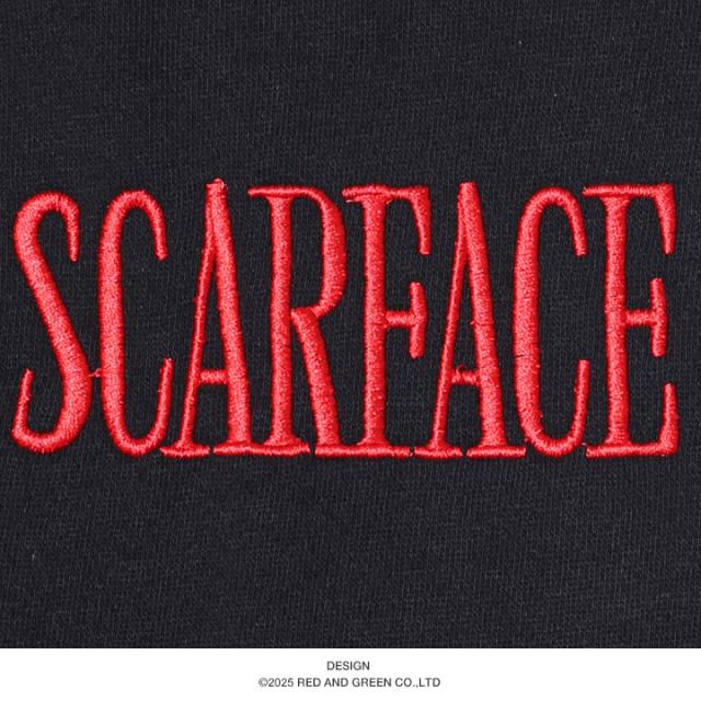 左胸には、映画タイトルの『Scarface』をテーマカラーの赤を用いた2D立体刺繍でオン。