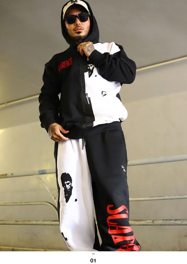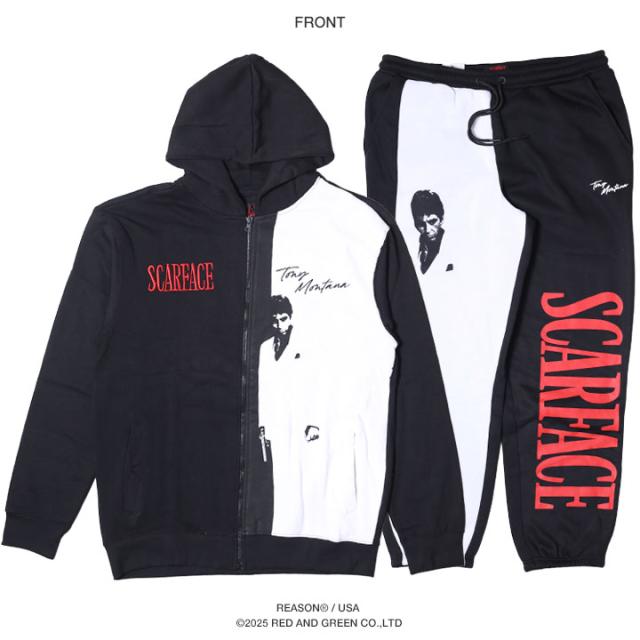 1983年公開のマフィア映画の名作「Scarface / スカーフェイス」 と「REASON」による、公式コラボレーションモデルの限定のセットアップ(ZIPパーカー×スウェットパンツ)。