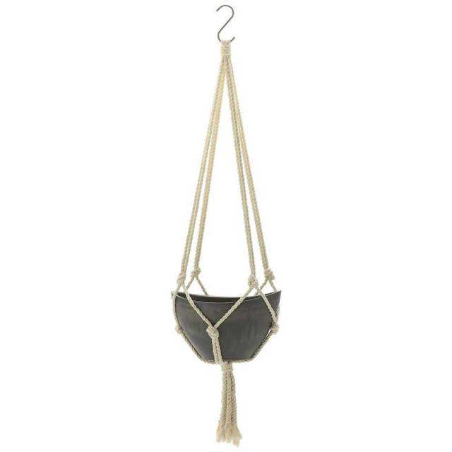 コットン製吊り具と自然素材風コンテナの組み合わせが魅力的な、室内専用のハンギングポットです。