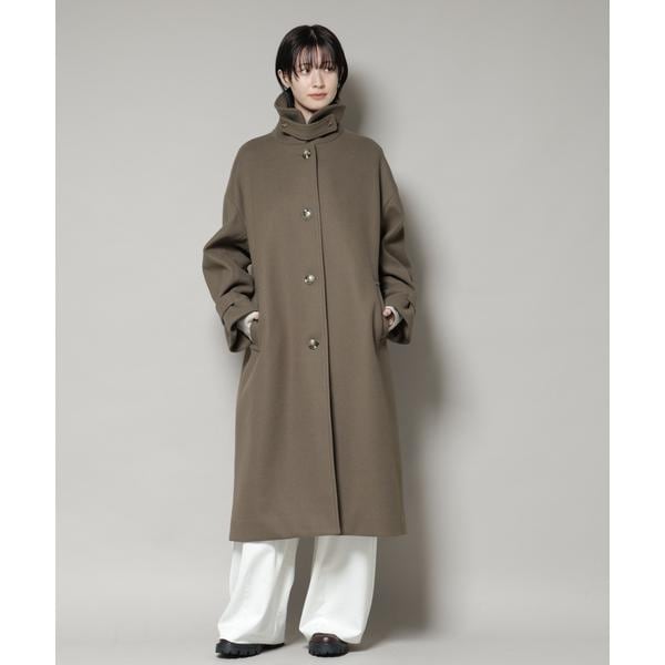布帛ライクなウール見えのジャージー素材で仕立てた大人顔ロングコート。首元のタブを留めてハイネックとしても着用可能で、ニットやジャケット等、インナーを選ばず気軽に羽織れて秋冬に頼れる一着です。