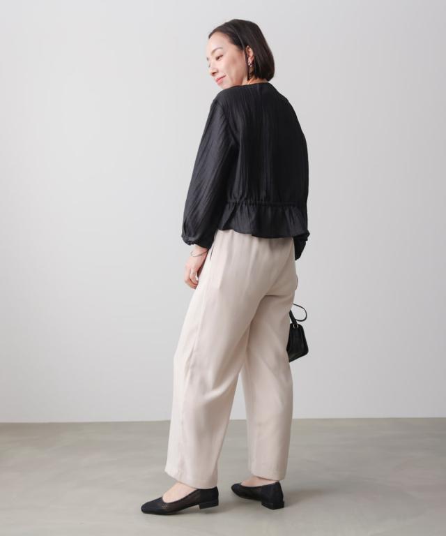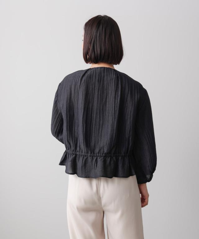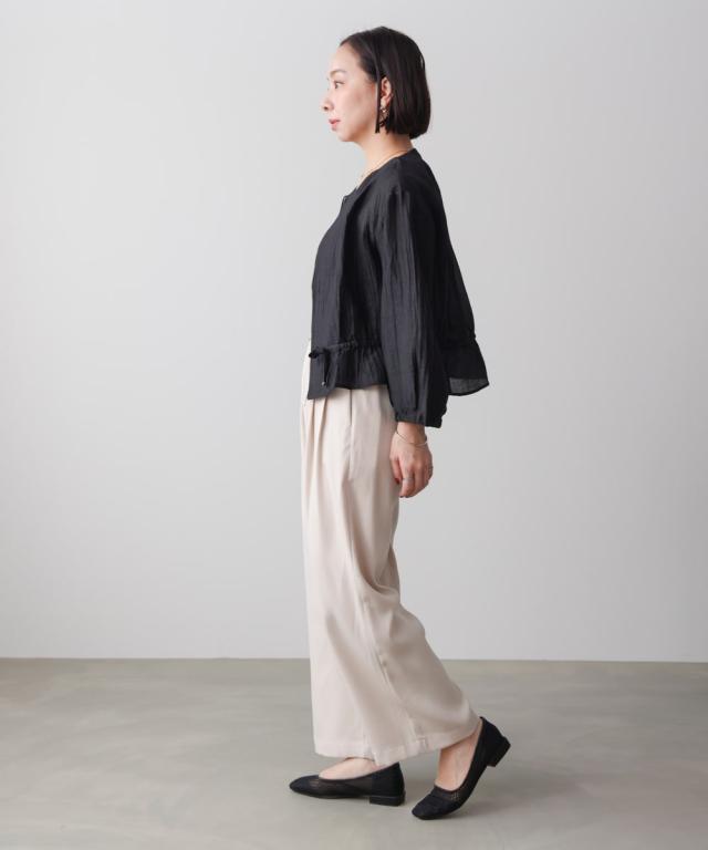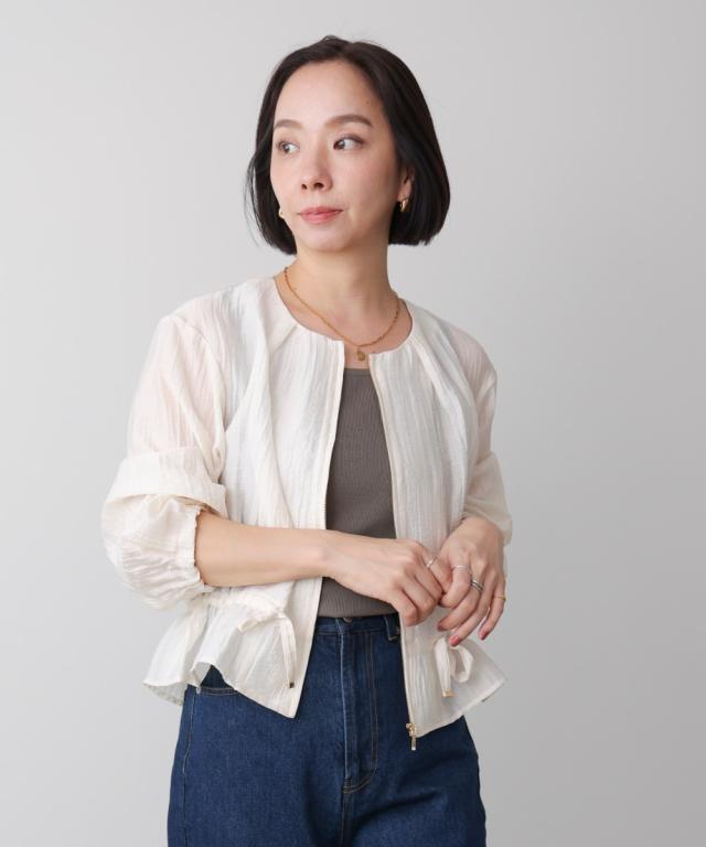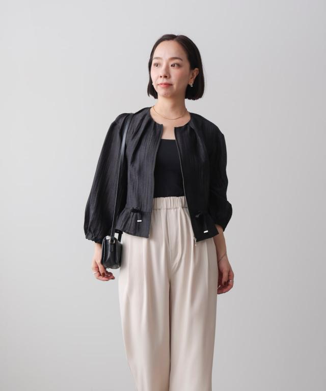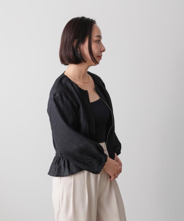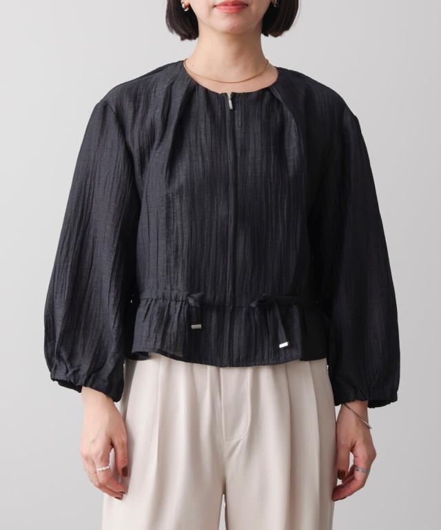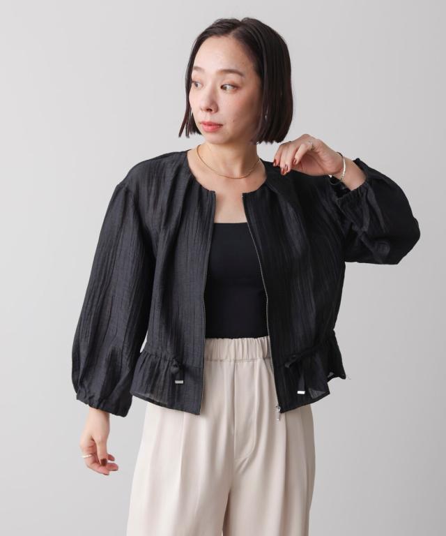 ノーカラーのきちんと感のあるウエストドロストブルゾンです。きちんと感がありながら、お袖のバルーンとウエストのドロストで、シンプルになりすぎずに、着こなして頂けます。温度調整が必要な時期で、ちょと、きちんと感を出したい時にあると便利な一枚です。軽く仕上げていますので、カーディガンのように気軽に着て頂けます。