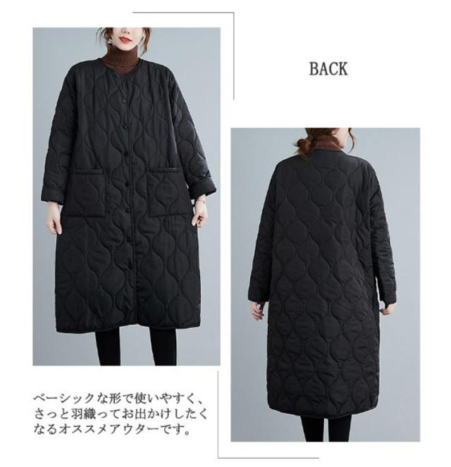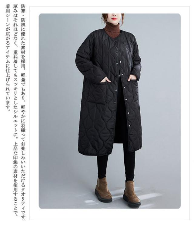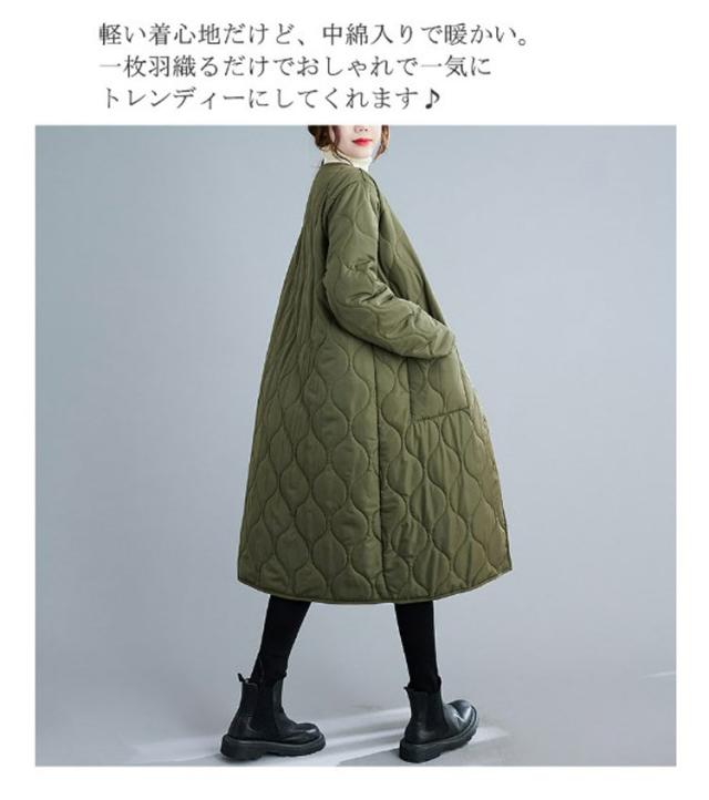 キルティングコート レディース ロングコート アウター ロング コート 中綿 フード付き ノーカラー 秋冬 キルティング 防寒 ジャケット 中綿コート 防寒コート 軽い ノーカラージャケット 無地 あ