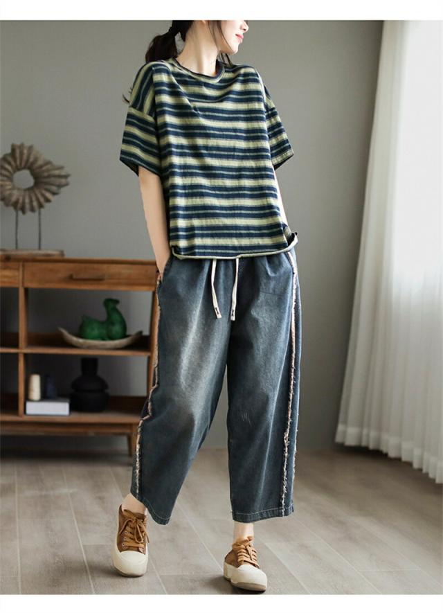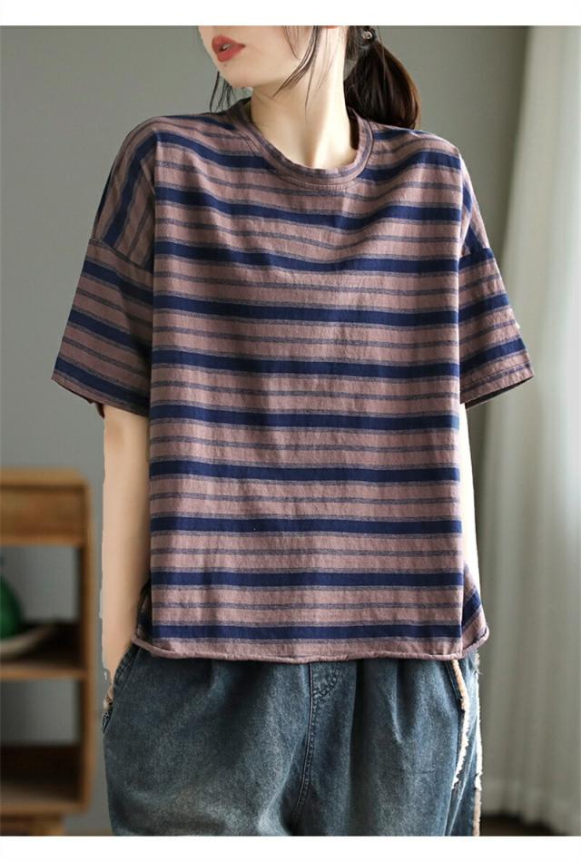 半袖 Tシャツ トップス 半袖トップス 半袖tシャツ レディース 夏 ボーダー柄 五分袖 ブラウス tシャツ 体型カバー ラウンドネック 二の腕カバー お洒落 かわいい レトロ トレンド カジュアル
