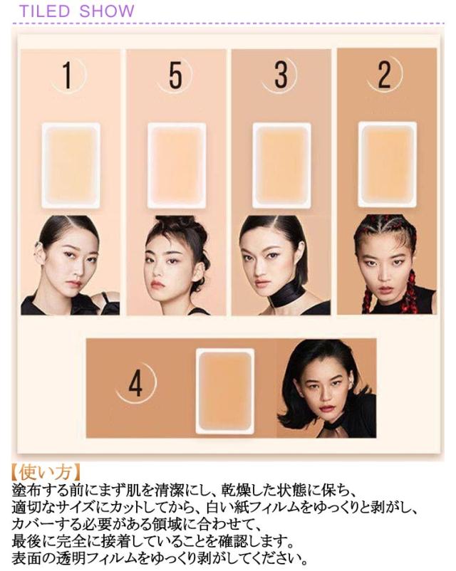 | 60枚セット!タトゥーを隠すカバーシール 【使い方】塗布する前にまず肌を清潔にし、乾燥した状態に保ち、適切なサイズにカットしてから、白い紙フィルムをゆっくりと剥がし、カバーする必要がある領域に合わせて、最後に完全に接着していることを確認します。表面の透明フィルムをゆっくり剥がしてください。 【超強力なカバー力】タトゥー、傷跡、あざ、白い斑点、ほくろ、あざ、キスマーク、などの難しいシミも簡単にカバーできます。 【耐久性】一度塗ると7日間は剥がれずに持続します。防水、防汗、傷防止、しわ防止、剥がれ防止などの機能があります。 【実用的なデザイン】エッジのグラデーションデザインにより、コンシーラーの中央が厚く、エッジの周りが透明になります。シミをカバーしながら自然ななめらか肌に整えます。また、コンシーラーパッチの質感は肌の質感を模倣しており、より本革のように自然で、繊細でリアルな質感を実現しています。 | |