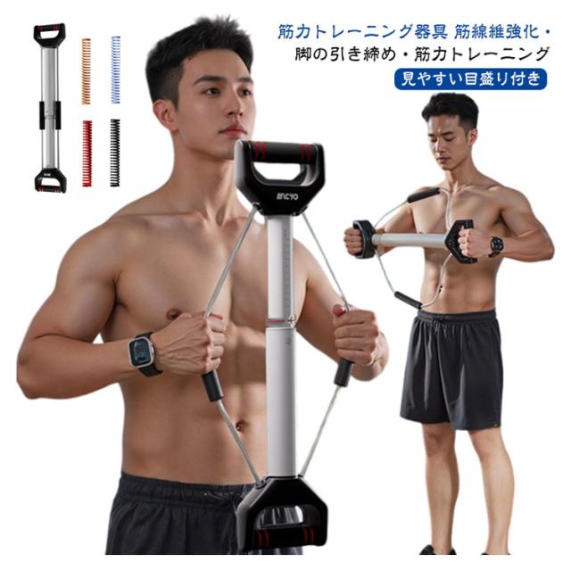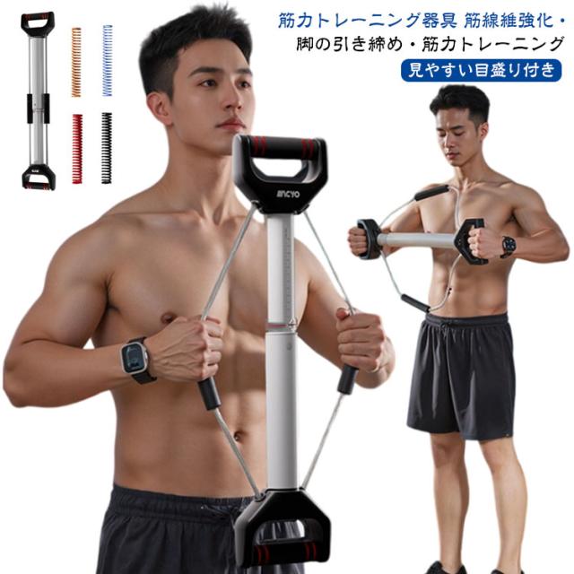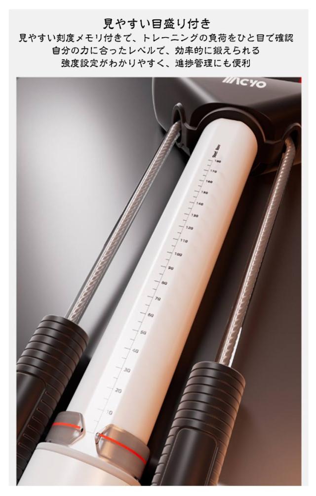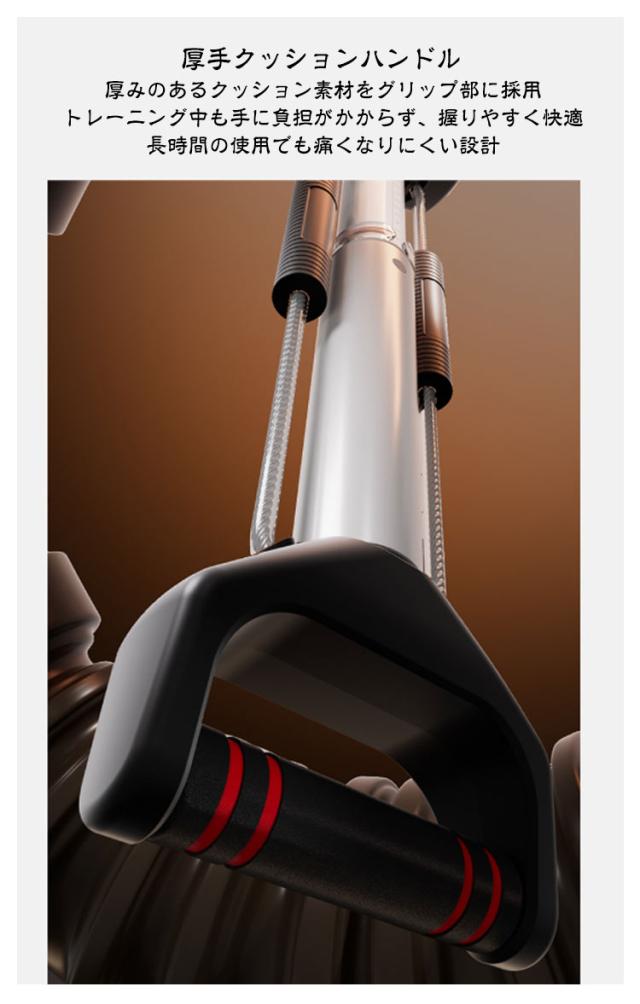 | 筋力トレーニング器具 筋線維強化・脚の引き締め・筋力トレーニング 1.厚手クッションハンドル 厚みのあるクッション素材をグリップ部に採用 トレーニング中も手に負担がかからず、握りやすく快適 長時間の使用でも痛くなりにくい設計 2.見やすい目盛り付き 見やすい刻度メモリ付きで、トレーニングの負荷をひと目で確認 自分の力に合ったレベルで、効率的に鍛えられる 強度設定がわかりやすく、進捗管理にも便利 3.アルミ合金素材 航空機にも使われる高強度アルミ合金を採用 軽量ながらも頑丈で、長期間のトレーニングに耐える設計 しっかり握ってもたわまず、安全性抜群 4.スチールワイヤー内蔵ケーブル 内部にスチールワイヤーを内蔵した高耐久ケーブル 高い引っ張り強度と伸縮性で、ハードな使用にも耐える構造 繰り返しのトレーニングでも劣化しにくく、安心・長持ち 5.収納ラクラク・場所を取らない コンパクト設計で省スペース収納 薄型ボディで壁に立てかけてもスッキリ インテリアに馴染みやすく、出しっぱなしでもおしゃれ | |