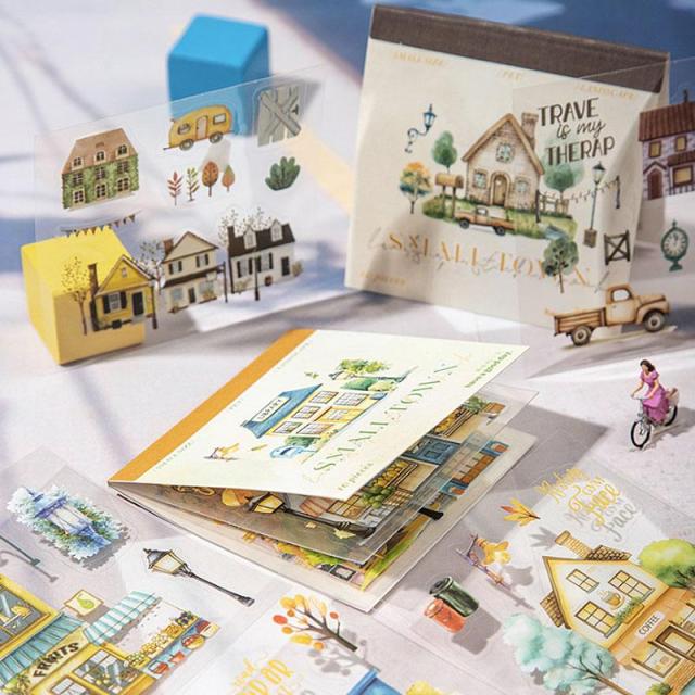 ST721 街並み 家 車 街灯 街路樹 道路 標識 ベンチ お店 シールブック コラージュ素材 コラージュ シール ステッカー 紙もの 手帳 日記 海外 紙モノ 紙物