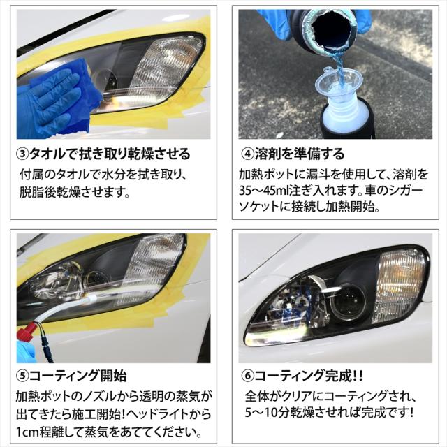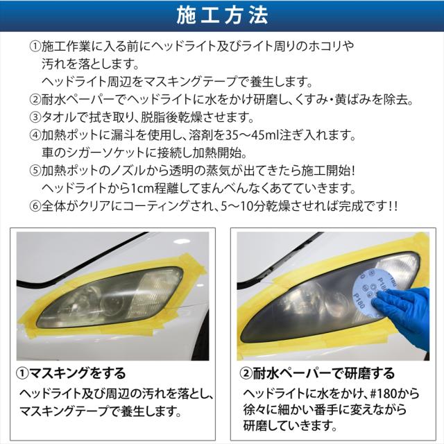 | 施工方法 | 1.施工作業に入る前にヘッドライト及びライト周りのホコリや汚れを落とします。 ヘッドライト周辺をマスキングテープで養生します。 2.耐水ペーパーでヘッドライトに水をかけ研磨し、くすみ・黄ばみを除去。 ◇ここがポイント!◇ しっかり研磨するほど綺麗に仕上がるのでこの工程は念入りに! 3.タオルで拭き取り、脱脂後乾燥させます。 4.加熱ポットに漏斗を使用し、溶剤を35〜45ml注ぎ入れます。 シガーソケットに接続し加熱開始。 5.加熱ポットのノズルから透明の蒸気が出てきたら施工開始! ヘッドライトから1cm程離してまんべんなくあてていきます。 6.全体がクリアにコーティングされ、5〜10分乾燥させれば完成です!! |