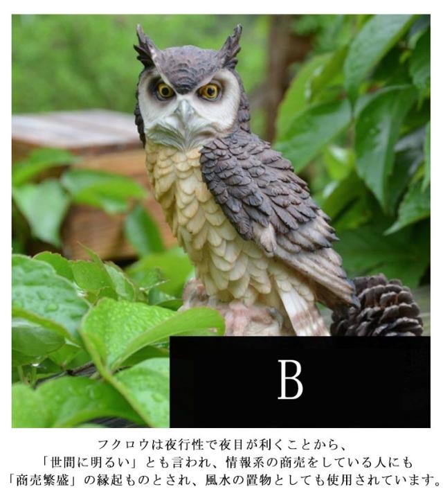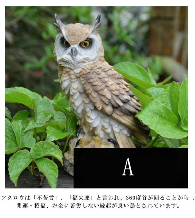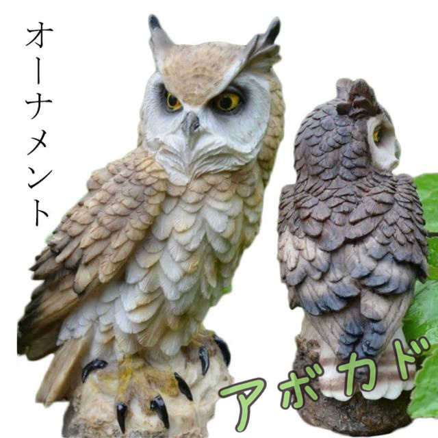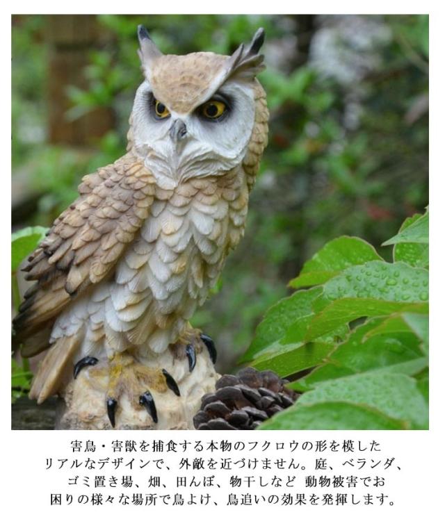 | 福を呼ぶフクロウ。縁起物としてお店やショップの開店祝いや 新築祝いの贈り物としてもおすすめです。 フクロウは「不苦労」、「福来郎」と言われ、360度首が回ることから 、開運・招福、お金に苦労しない縁起が良い鳥とされています。 フクロウは夜行性で夜目が利くことから、「世間に明るい」とも言われ、情報系の商売をしている人にも「商売繁盛」の縁起ものとされ、風水の置物としても使用されています。 害鳥・害獣を捕食する本物のフクロウの形を模したリアルなデザインで、外敵を近づけません。庭、ベランダ、ゴミ置き場、畑、田んぼ、物干しなど 動物被害でお困りの様々な場所で鳥よけ、鳥追いの効果を発揮します。 | |