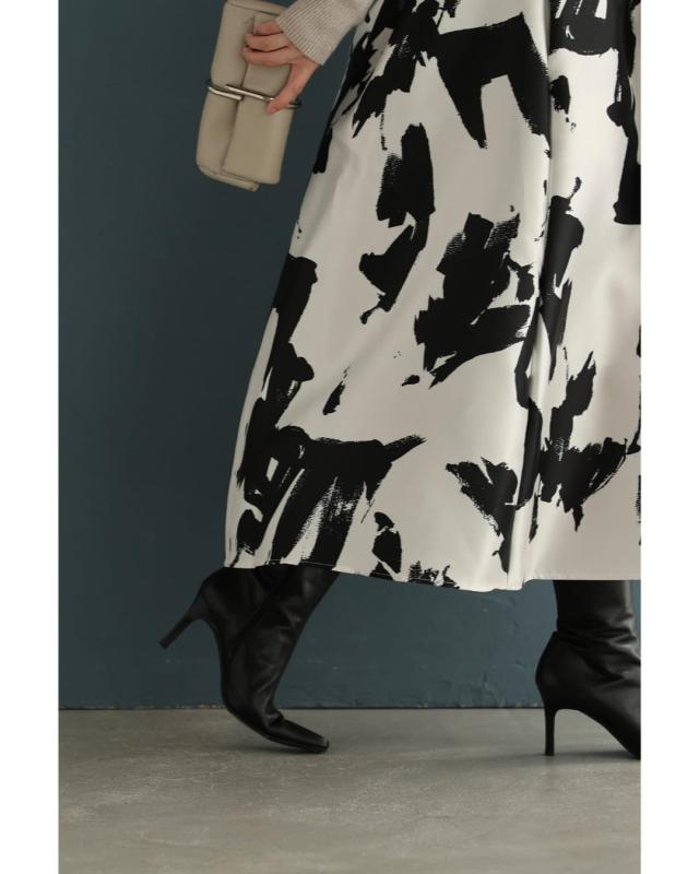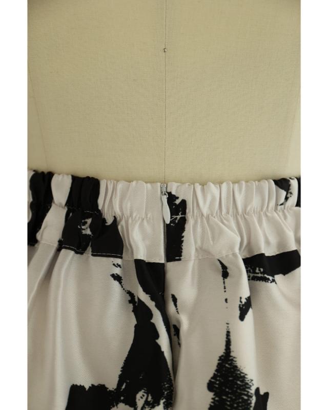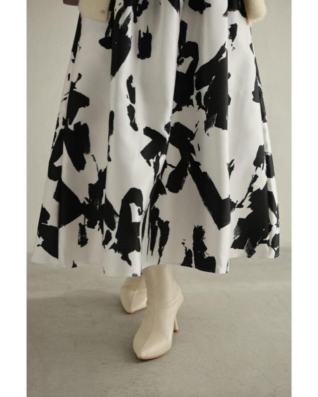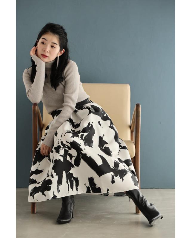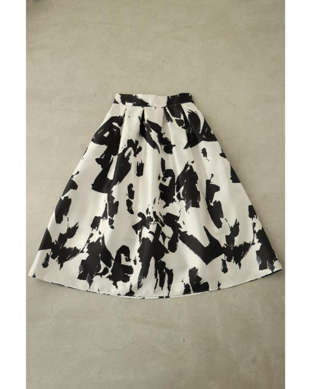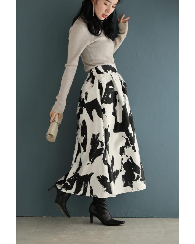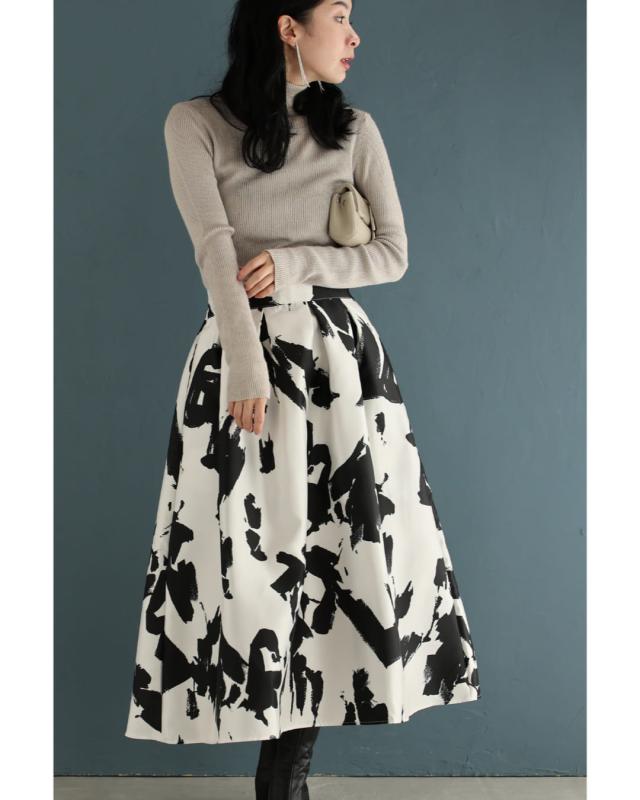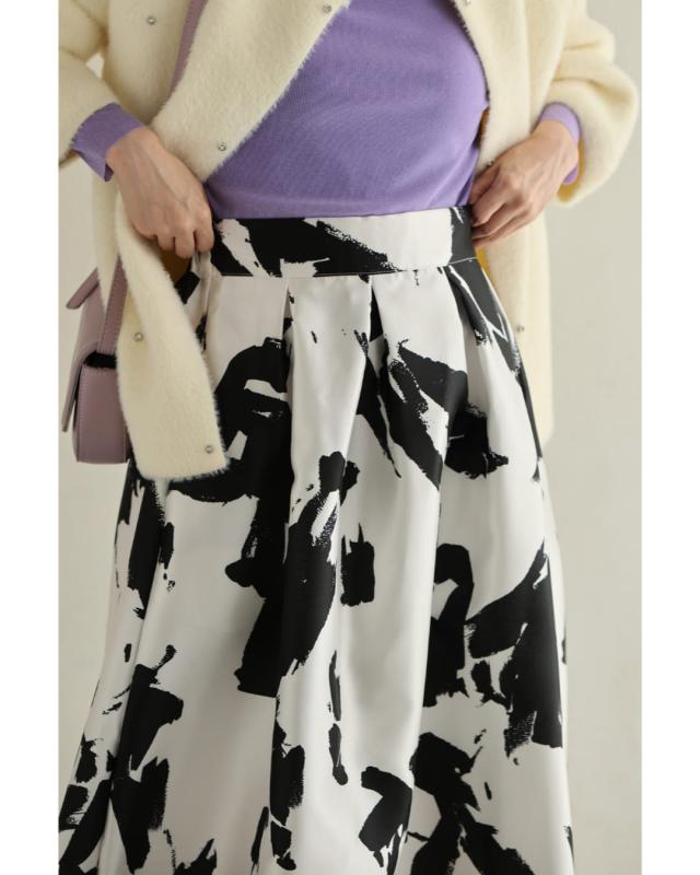 再入荷11月29日 モードなペイントアートのタックミディアムスカート cawaii wkj00261 S~L対応 デイリー使い おでかけ アート柄 立体感 ホワイト モノトーン 大人可愛い おしゃれ エレガント レディース ファッション 大人 ママ ミセス 30代 40代 50代 60代