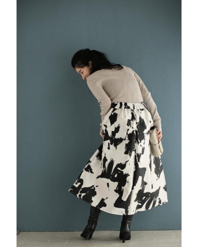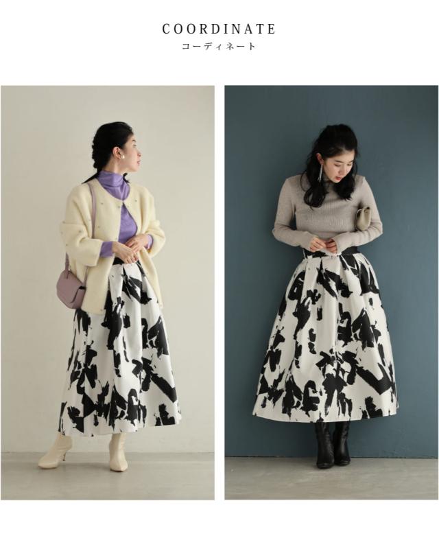 wkj00261 新作 新着 再入荷 CAWAII FRENCHPAVE フレンチパヴェ エレガント ベーシック カジュアル 可愛い かわいい カワイイ おしゃれ オシャレ お洒落 個性 個性的 定番 ベーシック 大人かわいい 大人可愛い 上品 女性らしい デザイン スタンダード ナチュラル きれいめ キレイめ シンプル フェミニン レディース レディースファッション 大人 ママ ミセス 30代 40代 50代 60代 モードな ペイントアート タック ミディアム スカート 後ろゴム ひざ下 フレア S M L ワンサイズ フリーサイズ フリー 小さめ 小さいサイズ 低身長 痩せ ほっそり 小柄 細身 標準サイズ ゆったり F サイズ自由 ワンサイズ 秋服 秋物 冬服 冬物 春服 春物 春 秋 冬 体型カバー お尻隠し 太もも隠し ホワイト 白 モノトーン 柄 総柄 プリント 普段着 日常使い ヘビロテ 毎日着れる デイリー使い おでかけ アート柄 立体感