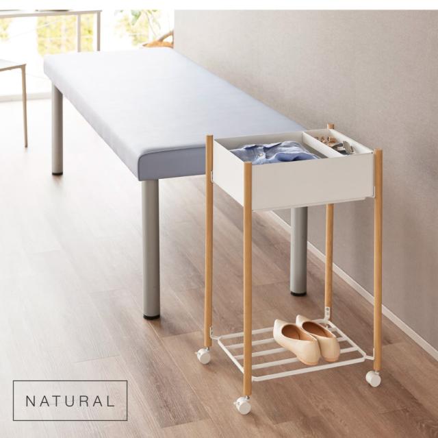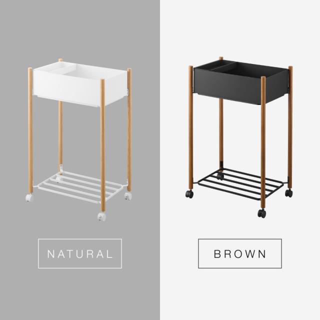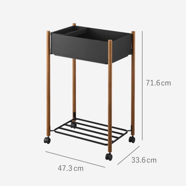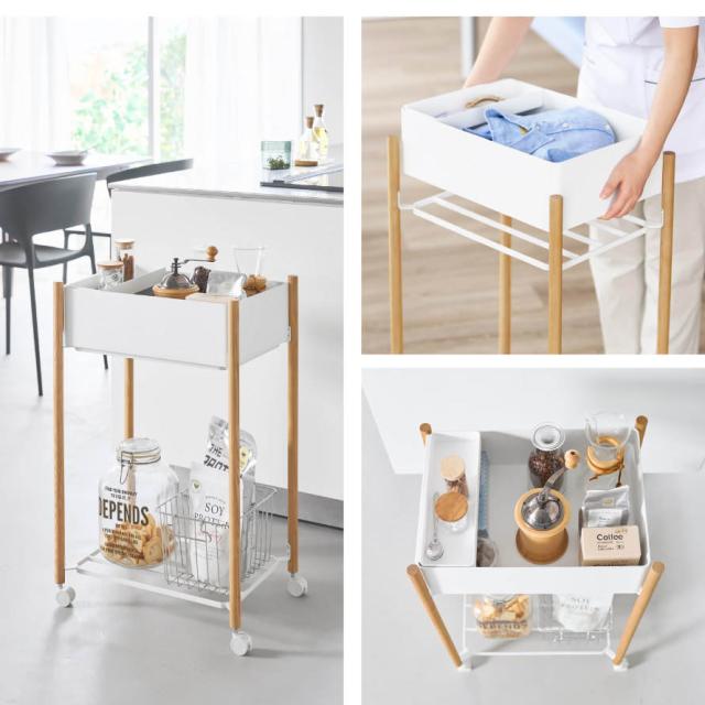 ■材質:棚/スチール(粉体塗装)、支柱/天然木(ウレタン樹脂塗装)、バスケット・小物トレー/ABS樹脂、キャスター/ナイロン