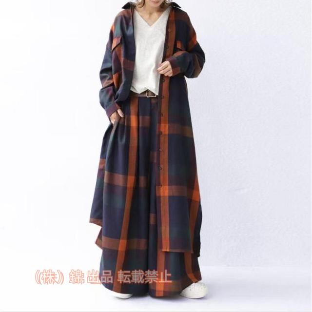 セットアップ レディース 春 長袖 シャツワンピース ロングシャツ ワイドパンツ チェック柄 ロングパンツ 2点セット 株式会社錦 カジュア 体型カバー 2way