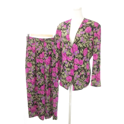 【中古】ランバン スーツ セットアップ 2点セット ノーカラージャケット 背抜き ワイドパンツ 絹 花柄 44 XS 黒