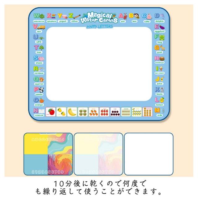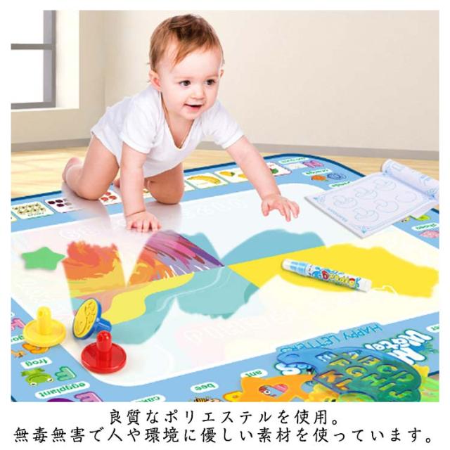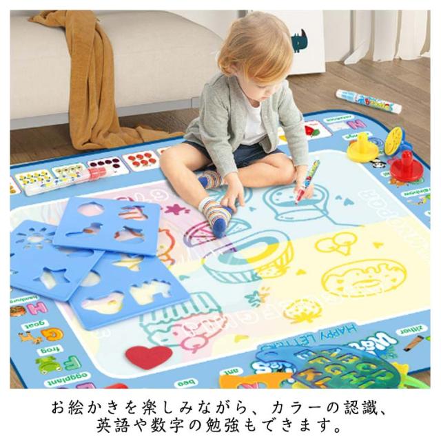 | ■商品情報 水だけでおえかきできるお絵描きシートです。床、壁、洋服を汚さずに遊んで頂けます。100cm前後の大きいシートですので、子供が自由にのびのびと楽しくおえかきできます。お子様への誕生日・入園・入学・クリスマスプレゼントとしてもぴったりです。 ■材質 良質なポリエステルを使用。無毒無害で人や環境に優しい素材を使っています。 ※カラー: 写真参考 ■セット内容 パッケージが含まれる: 落書きマット×1本 マジックペン×3 グラフィックテンプレート×2 ローラースタンプセット×1 ドローイングブックレット×1 ■ポイント 【お水で簡単】 付属のペンに水を入れて専用のお絵描きシートに描くことでお絵描きが楽しめます。10分後に乾くので何度でも繰り返して使うことができます。シートは折り畳んで収納でき持ち運びも便利です。 【知育おもちゃ】 水で描くとシートのの色が発色する不思議なシートです。お絵かきを楽しみながら、カラーの認識、英語や数字の勉強もできます。子供の右脳開発、手眼調和、認識能力、創造力などを向上させることができます。 【収納しやすい】 おえかきあそび、ぬりえあそびがが終わった後、おえかきシートを折り畳んで収納できます。ペンとスタンプをしまえる収納ボックス付きです。 注意:収納する前にはおえかきシートを乾かしペンの水を捨ててください。 | |