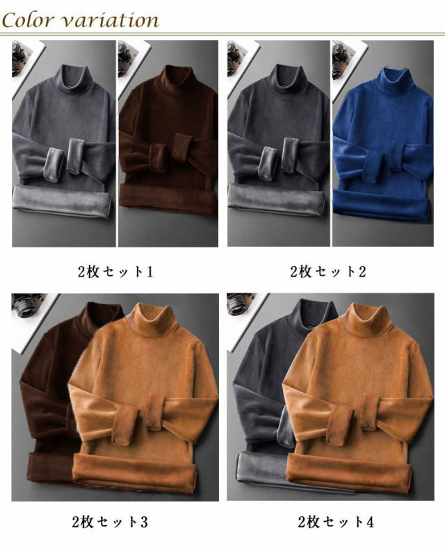 | 2枚セット!保温性抜群のタートルネック長袖インナーシャツ。 生地は柔らかく、肌触りがよく、防寒・保温性能にも優れるのが特徴です。 シンプルで定番なデザインでラフにも絶妙なフィット感でシルエットを崩しません。 どれもコーデに使いやすいので色違いで持っておくのもオススメです。 暖かいインナーシャツとして使用するか、屋外で着用することをお勧めします。 | |
