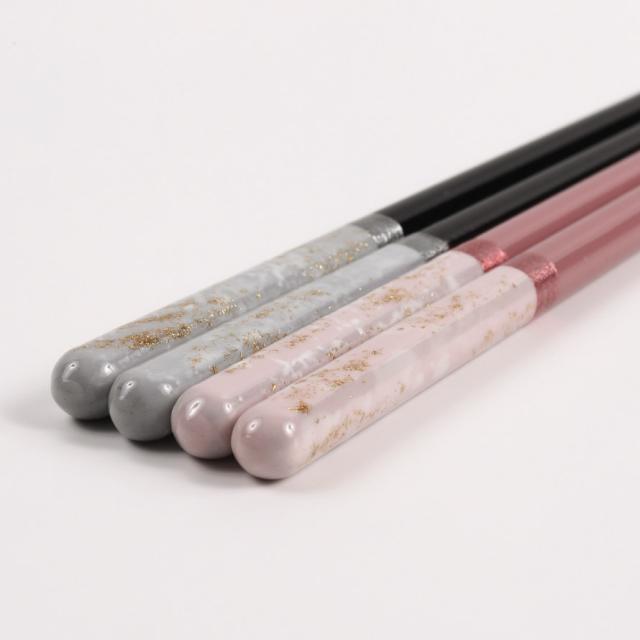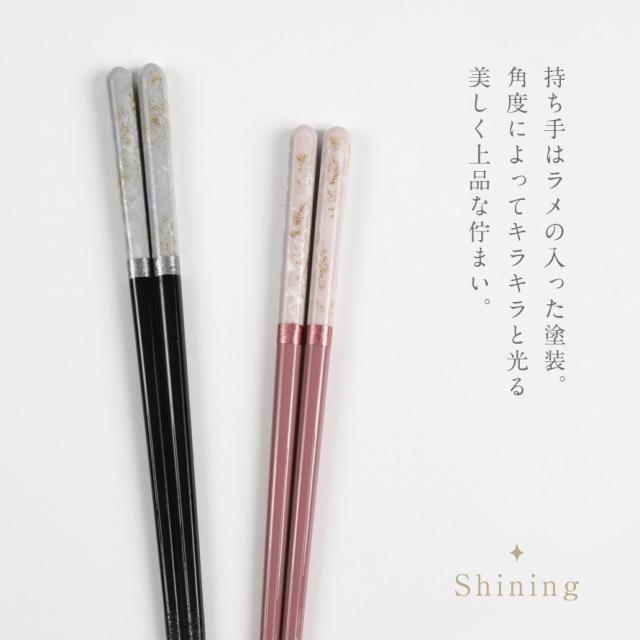 結婚祝い、結婚記念日、敬老の日、新築祝い、長寿祝いなど、感謝を伝えたいギフトとしても人気がある、夫婦箸ギフト。日本の伝統を取り入れながら和食だけでなく洋食にもマッチするモダンなお箸&箸置きのセットです。持ち手の切り替えカラーは、繊細で上品な佇まい。ラメの入った塗装は、角度によって光の当たり具合が変化し、いろんな表情を持った美しい仕上がりです。