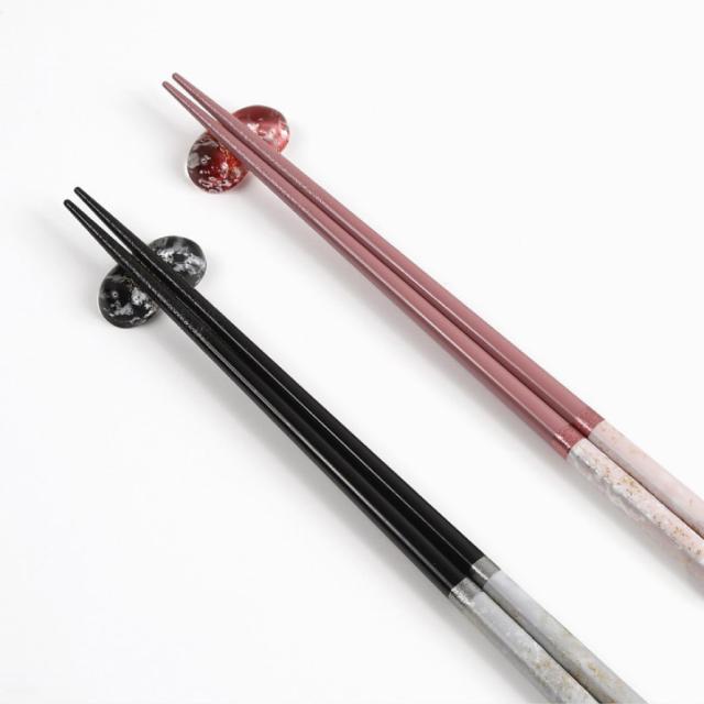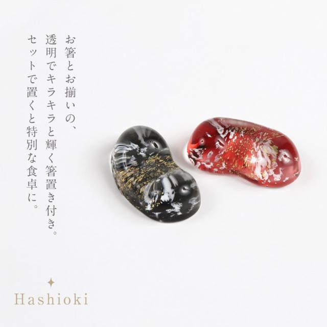 お箸とお揃いの、透明でキラキラと輝く箸置き付き。箸とセットで置くと特別な気分に。食卓が華やかになります。