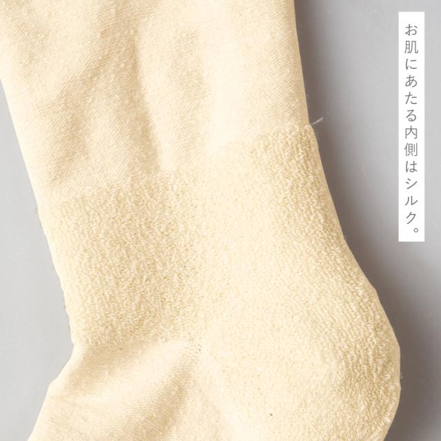 外側に丈夫な綿を使用し、お肌に当たる内側にシルク(約48%)を使用した2層構造トゥレスハイソックスです。