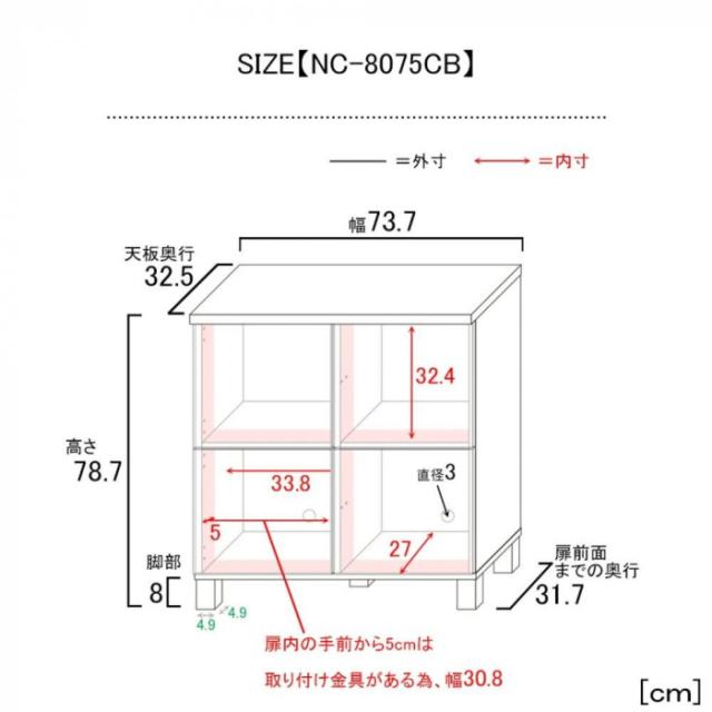 | サイズ | 外寸:幅73.7×奥行32.5×高さ78.7cm、扉収納内寸:幅33.8×奥行27×高さ32.4cm、丁番がある(扉内の手前5cm):幅30.8cm、脚部:8cm 個装サイズ:78×36×17.5cm |