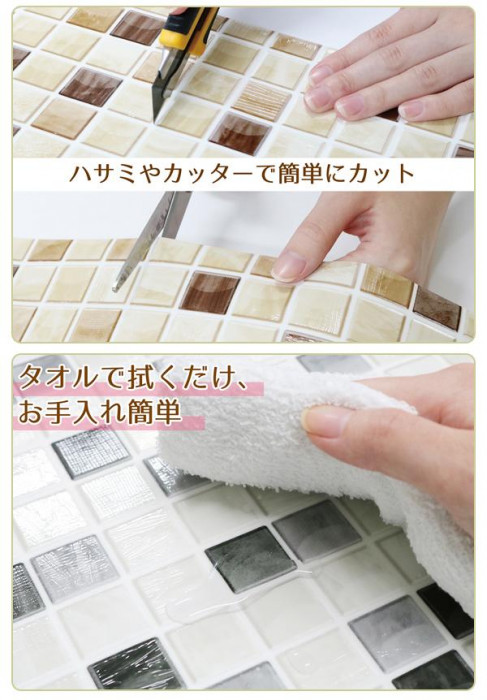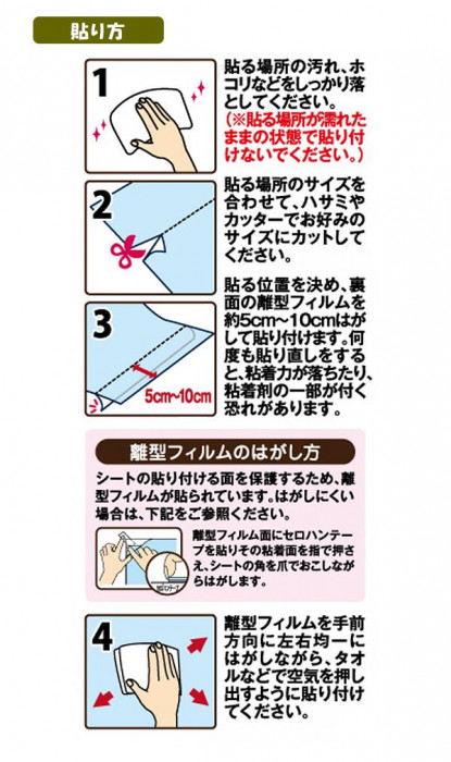 商品詳細:賃貸住宅でもDIYを楽しみたい!!そんなあなたにピッタリ♪貼りたい場所のサイズに、ハサミで簡単にカットすることができます。ピタッと簡単に貼れてズレないのに、キレイにはがせます。防水性に優れているので、汚れてもサッと拭くだけでOKです。 生産国:日本 素材・材質:表面:塩化ビニル樹脂 中間層:ポリエステル粘着剤:アクリル系樹脂 商品サイズ:80×100cm、厚み:0.24mm 付属品:取扱説明書