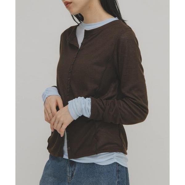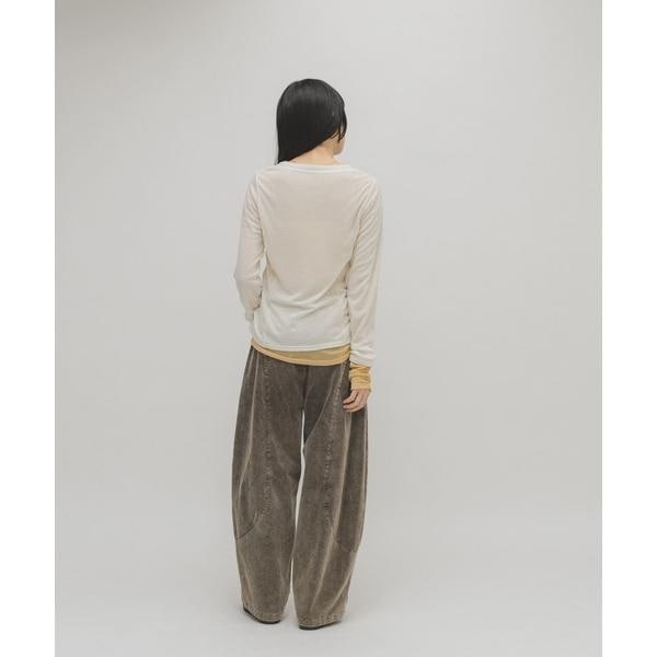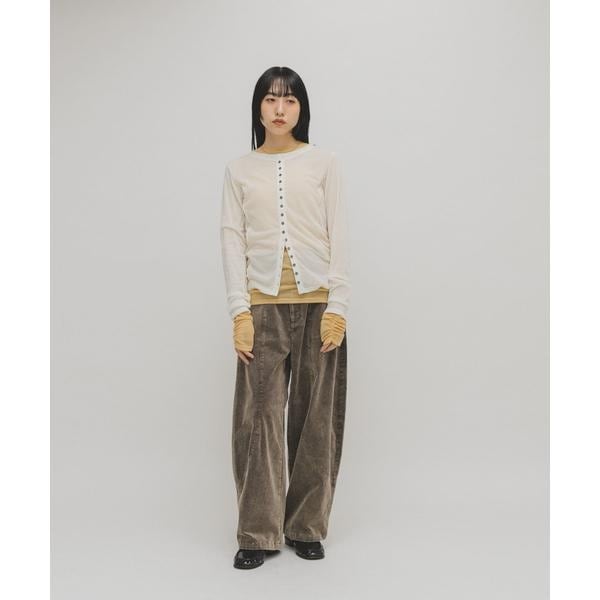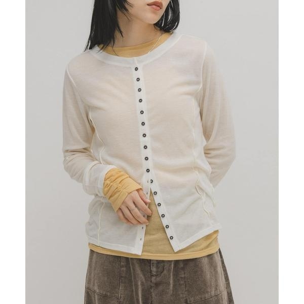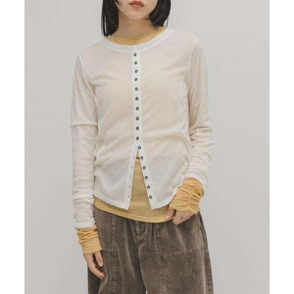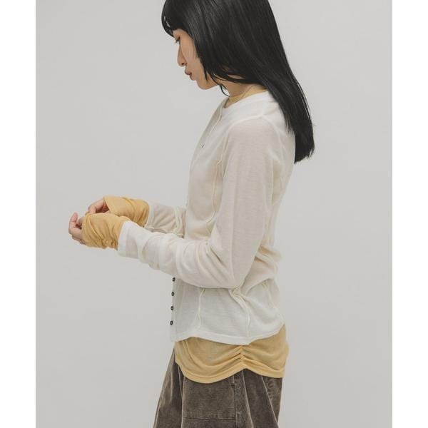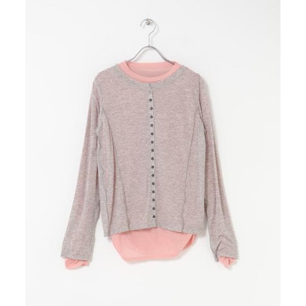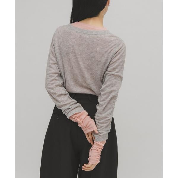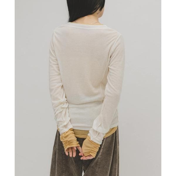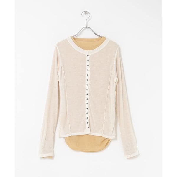 柔らかく肌触りの良い素材を使用したレイヤードカットソー。インナーは袖と裾両サイドにギャザーを入れることで動きのあるデザインにしました。上に重ねたカットソーは、メロー切り替えがポイント、多釦使いがポイントです。配色カラーが存在感を放ち、取り入れるだけで旬なスタイリングが完成します。