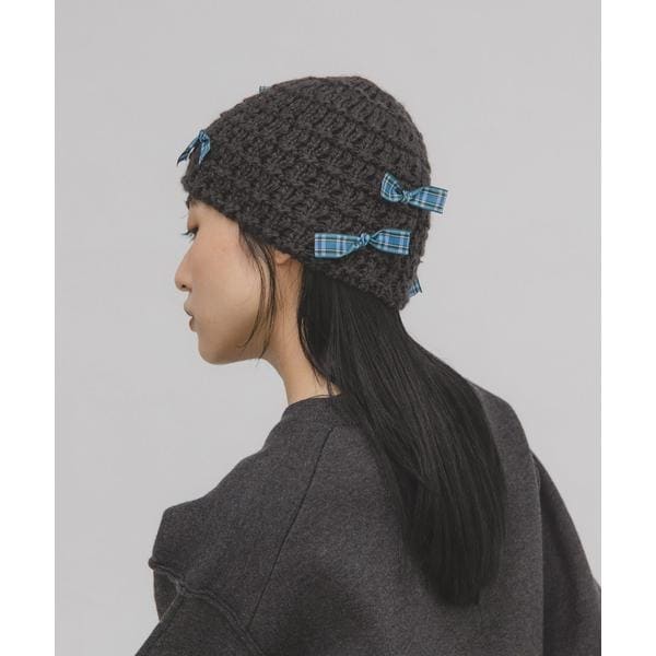 ニットビーニーに、チェックリボンを付けることで存在感抜群なアイテム。可愛くなり過ぎないよう、チェック柄にこだわり、リボンの垂れをなくしたりしてモードめに仕上げました。