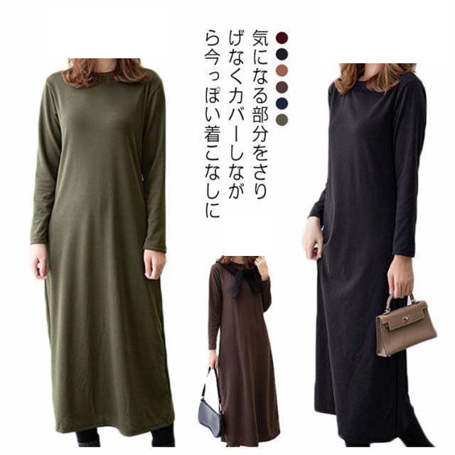 ワンピース 長袖 ロング きれいめ 大 ワンピース 続々登場 モカ ワイン ブラック ブラウン ネイビー カーキ M L XL