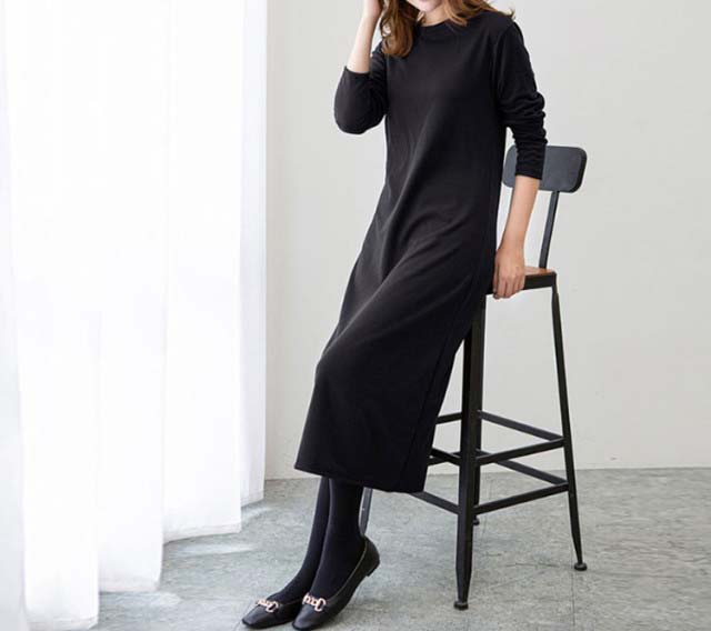 膝が隠れるロング丈とゆとりのあるサイジングで楽に着られ、体型カバーにも。