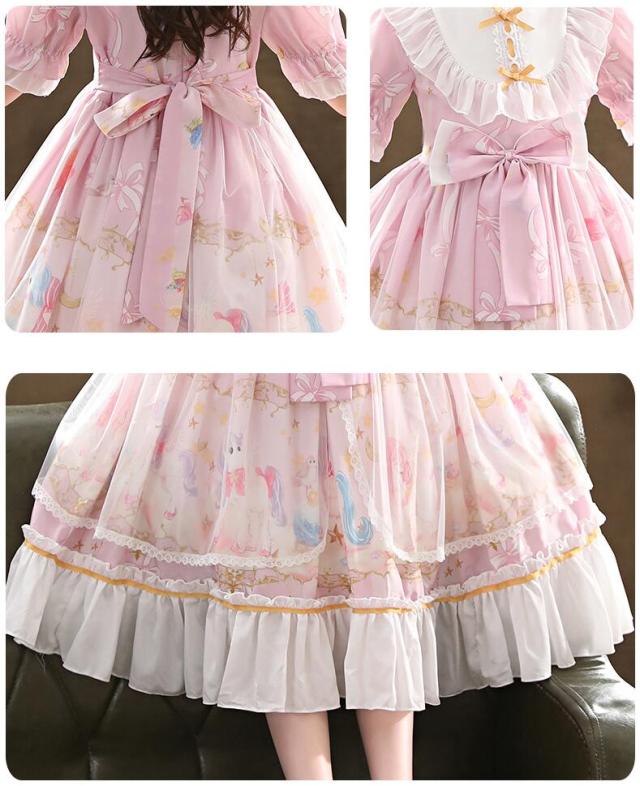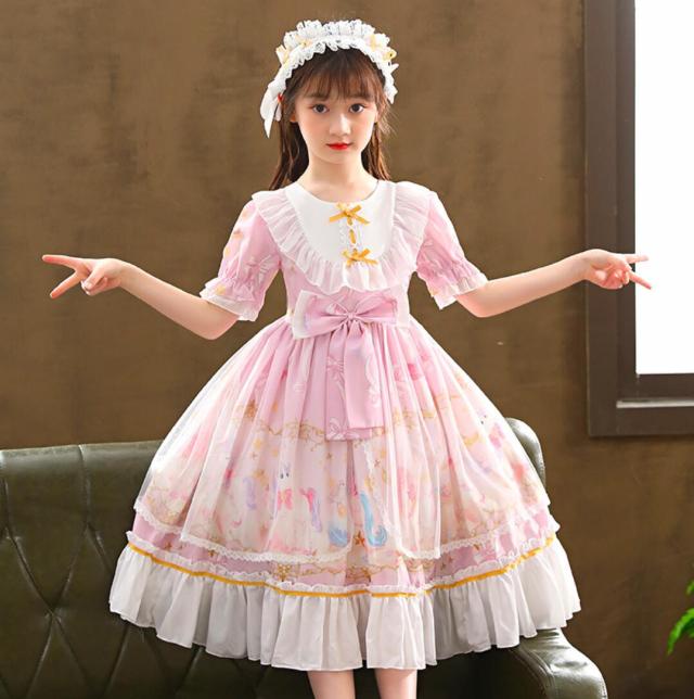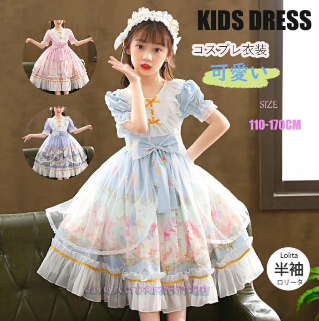 ロリータワンピース 子ども半袖ワンピース 子供ロリータ服 lolita キッズドレス ゴスロリ チュール フリル 甘ロリータ プリント柄 姫様ドレス お姫様コスチューム コスプレ衣装 学園祭 ジュニア