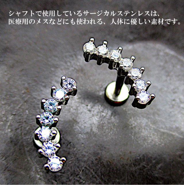 7石のキュービックストーンが美しいカーブを描く、ラブレットスタッドボディピアスです。モチーフが耳のカーブに沿ってフィットするデザインで、耳軟骨などにオススメ。
