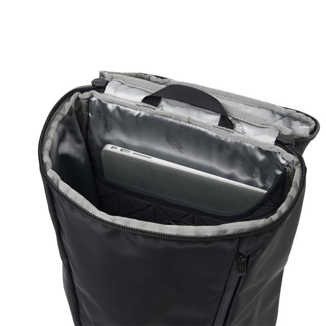 荷物が入っていなくても自立する構造で、大きく開閉するメインコンパートメントは収納しやすく、15インチまで対応するPCスリーブとガジェットや小物の収納に便利なオーガナイザーポケットを内蔵。フラップを開けたまま移動できるように、本体内側にグラブハンドルを備えています。フリースをライニングしたトップポケットは、荷物を収納してもスマートな形をキープ。フロントの縦型ポケットは止水ファスナーを備えているため、傘やボトルなどの収納に便利です。