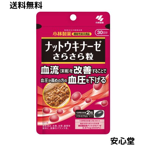 小林製薬の機能性表示食品:ナットウキナーゼ さらさら粒 サプリメントは、中高年の健康維持に役立つナットウキナーゼサプリ。納豆菌が作り出す酵素、納豆キナーゼは、血流(末梢)を改善し、高めの血圧を下げることをサポートする機能が報告されています。小林製薬が開発した納豆キナーゼ特化の血圧対策サプリです。健康のために納豆を摂りたいけど味やニオイが苦手、さかなの調理が面倒…そんな方に! 旅先や職場にも持っていけるため毎日手軽に続けられる納豆キナーゼサプリメントで、簡単にナットウキナーゼとDHA・EPAを摂取してください。