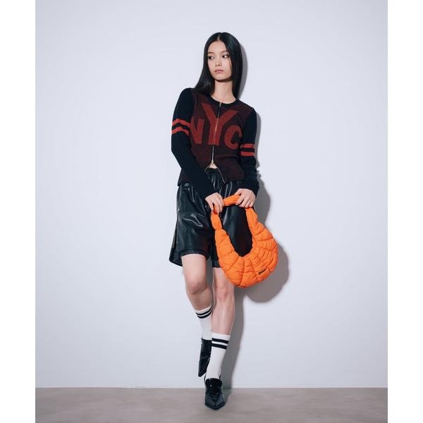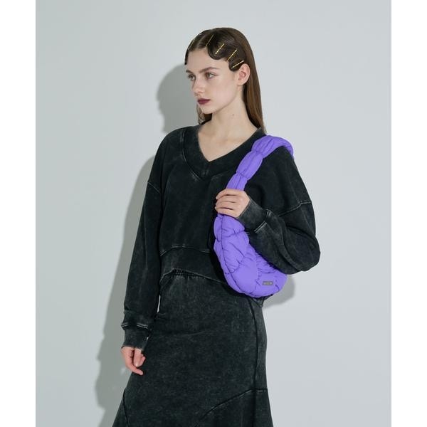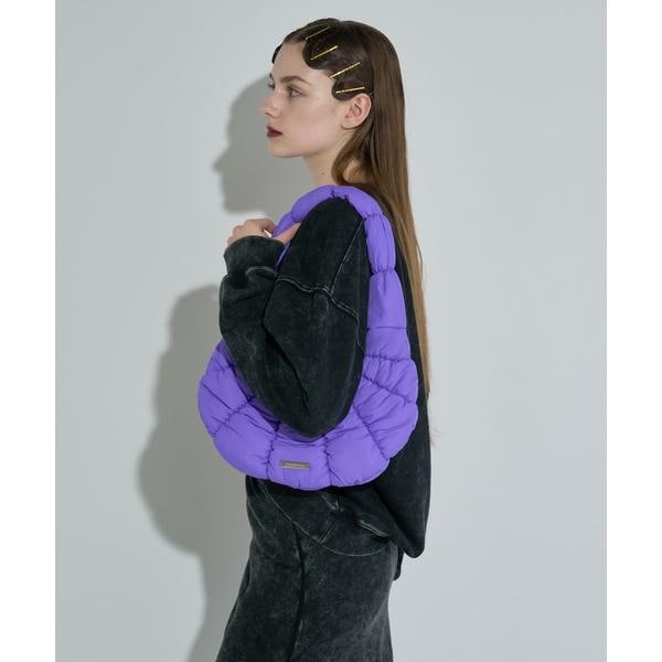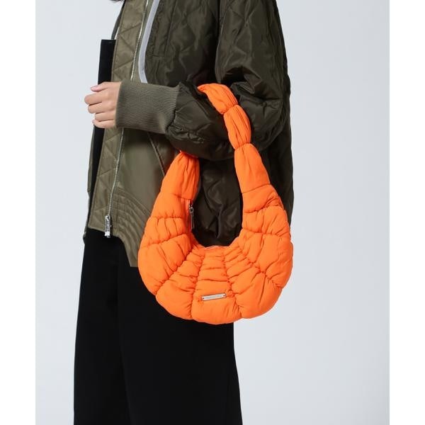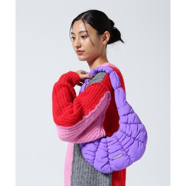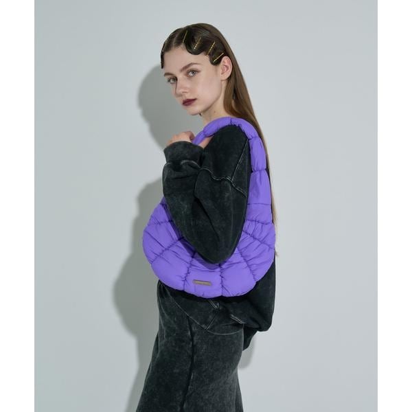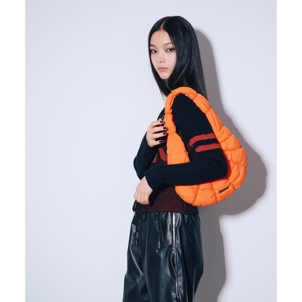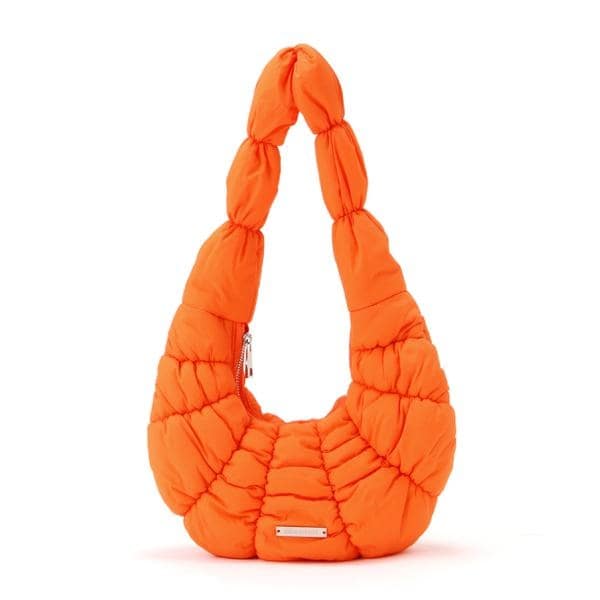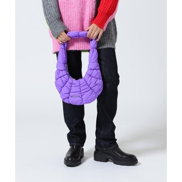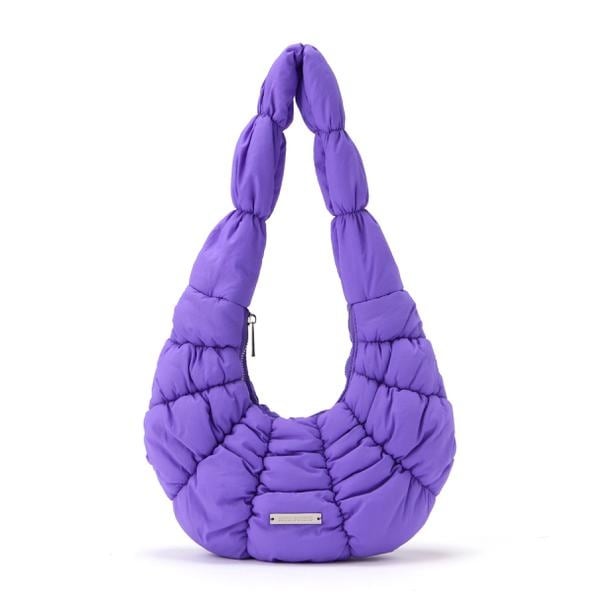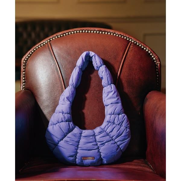 ぷっくりとしたキルティングデザインが目を惹き、まるでクロワッサンのようなユニークなフォルムのショルダーバッグ。程よいボリューム感と軽さを両立したポリエステル素材で、持ちやすさも◎。存在感がありながらもカジュアルスタイルに見やすく、コーディネートのアクセントになるアイテムです。ファスナー付きで、内側には異なる裏地を採用しており、チラリと見えるカラーが遊び心たっぷりでポイント。