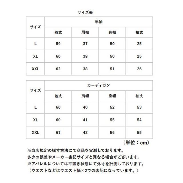 | サイズ | [レディース] ・Lサイズ ・XLサイズ ・XXLサイズ ※サイズについて詳細は、商品画像の中にあるサイズ表をご覧くださいませ。 |